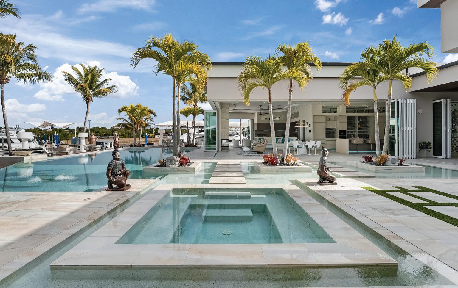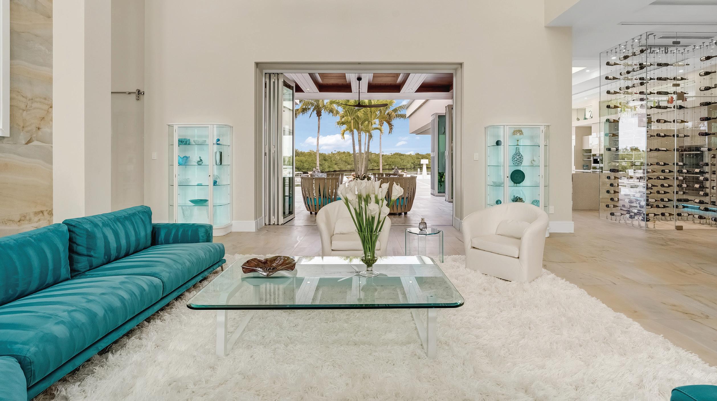 Outdoors, the residence transitions seamlessly into a resort-caliber environment. A zero-edge pool and spa overlook the water, framed by expansive terraces and entertainment zones supported by a fully integrated sound and lighting system. The primary suite and private living quarters are thoughtfully separated from guest accommodations, allowing both retreat and hospitality to coexist. Completing the estate is a multi-bay garage designed to accommodate a serious collection, and proximity to private and international airports, fine dining, beaches, and world-class shopping, all within minutes.