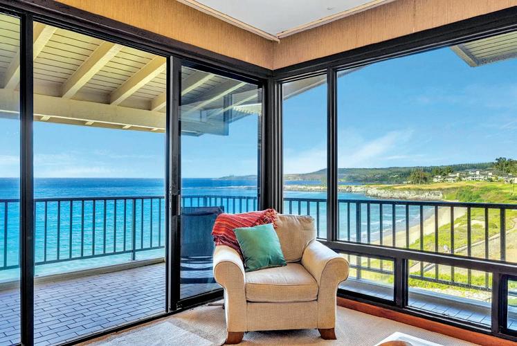 1 BR, 2 BA, 995 SF. Bridge level entrance with second floor ocean front bedroom. Breathtaking views over Oneloa Bay stretching to the enchanting island of Molokai complemented by whales frolicking during whale season. Wake up to views of Molokai, ocean, white sand beach & Plantation Golf course.