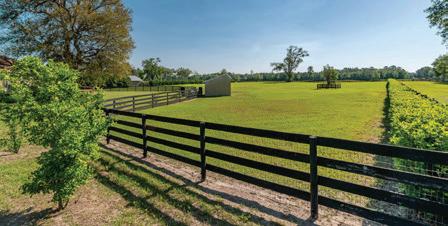 The residence sits on an elevated bliss in a serene setting surrounded by magnificent oak trees. The three-bedroom, three-bath split home offers an expansive living area. There is an eight-stall