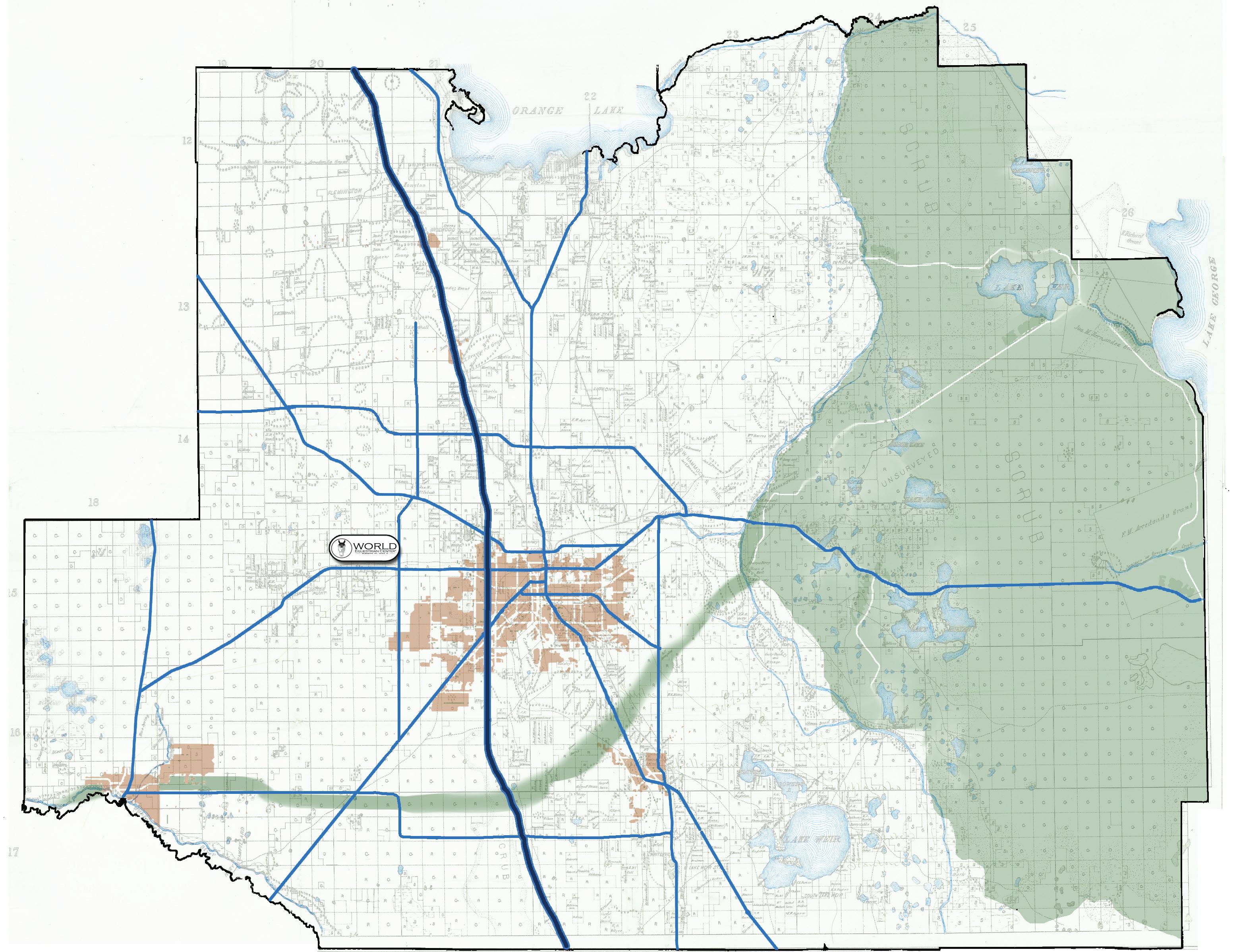 125± acre equestrian estate located off the prestigious 225A Golden Corridor, just 12 miles from the World Equestrian Center. Main residence and staff housing, three barns (47 stalls), an office, apartment, a Eurosizer, a jump area and two RV hook-ups. 3 Picturesque lakes enhance the charm.