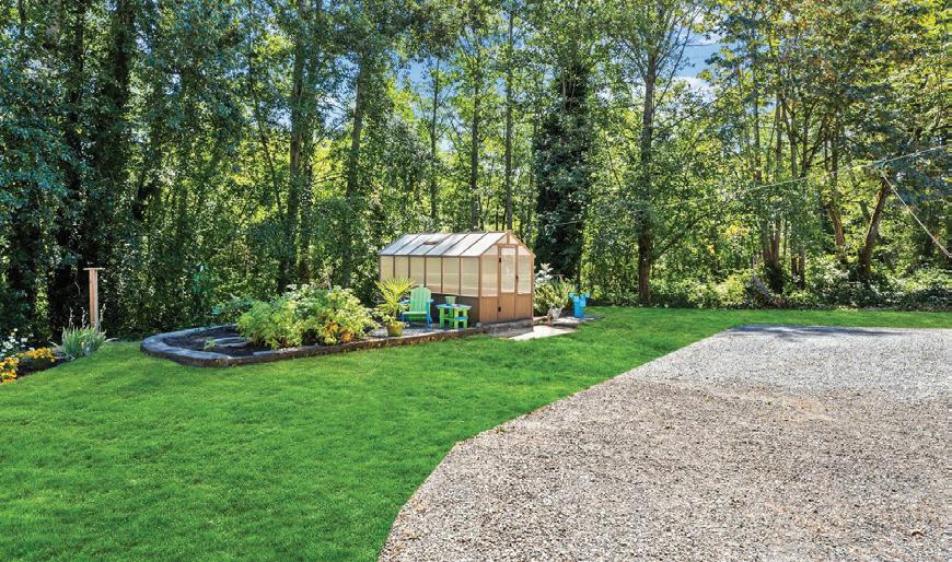 Exterior highlights include a Mansard roof, 2-car garage with a large parking pad, an attached greenhouse, and a garden area. There’s also a unique cement room under garage ideal for hobbies and storage.