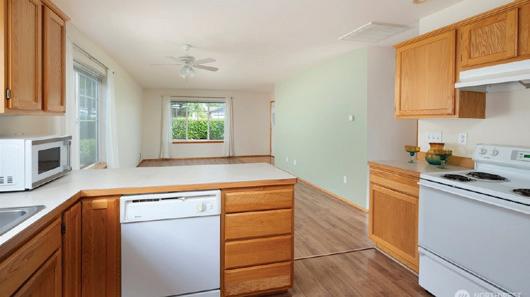 Welcome to this delightful single-story craftsman home, nestled in the highly sought-after 55+ Whidbey Cottages community. This move-in-ready home offers 928 ± sq ft of thoughtfully designed living space flooded with natural light, a welcoming covered front porch, and two bedrooms, each attached to their own bathroom. Great room design with endless windows. Kitchen designed for saving steps, with the benefit of two pantries. This leads to a conveniently located utility/laundry area and onto a finished one car garage with storage possibilities and designated parking space. This community also offers you a wonderful clubhouse and multi-purpose room and plans for installing siding with exterior painting and new roofing for you to enjoy for years to come. Close to city services, shopping and transit line.