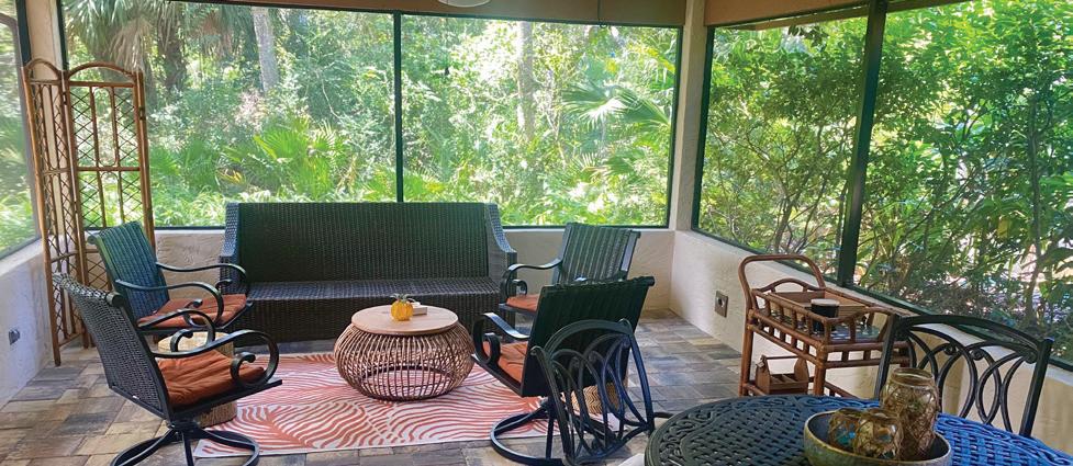 in a lush tropical setting. Super cute, Boho style cottage with two beds and two baths, an An updated living area with beautiful French doors leading to Florida room w/ new pavers & screens that backs up to a nature preserve for privacy. Gated community with world class amenities. Two pools, a beach club and