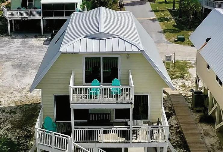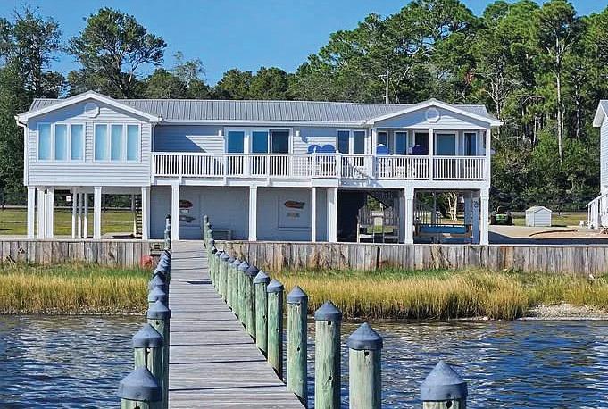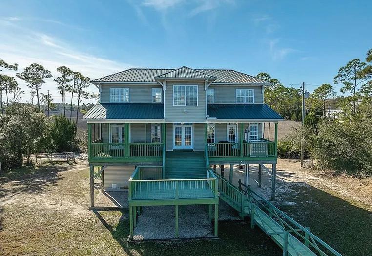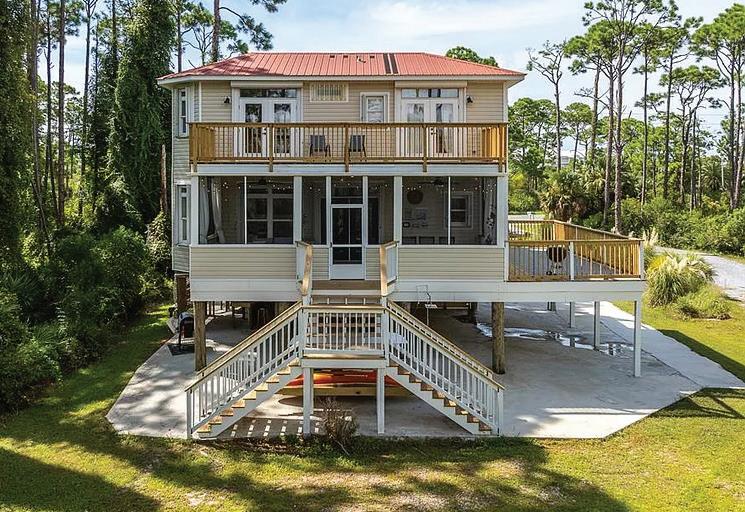 Set on a private acre along Apalachicola Bay, this five-bedroom, five-bath Craftsman bungalow is a rare coastal treasure. With sweeping views of three Gulf barrier islands and a private dock stretching into the bay, the property offers both privacy and beauty.