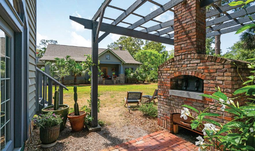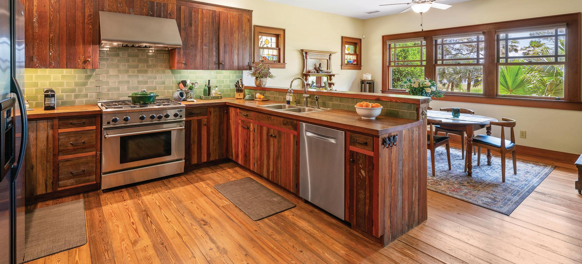 Built in 2005, the home reflects the Arts & Crafts tradition with cedar shake siding, heart pine floors, and extraordinary use of reclaimed “deadhead” cypress, salvaged from the Apalachicola River. Handmade stained glass, Green Man art tiles, and custom millwork showcase the artistry woven into every detail.