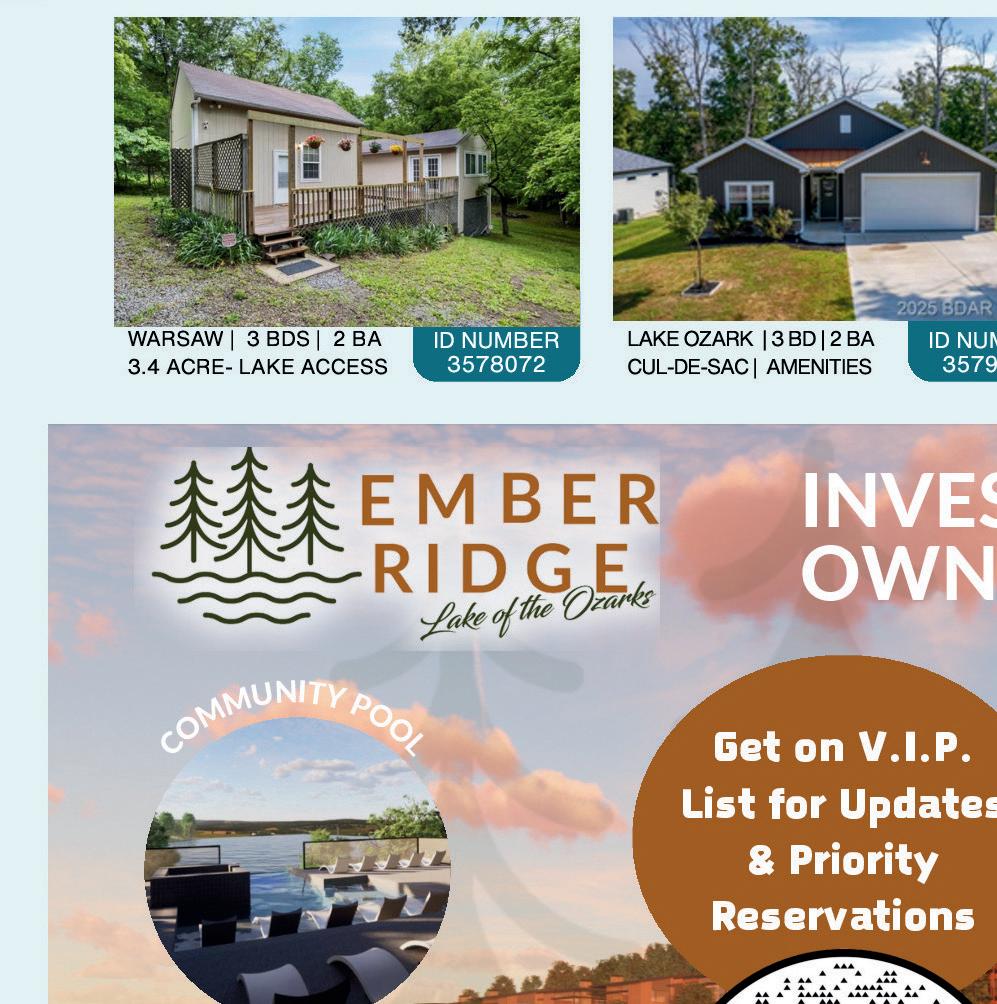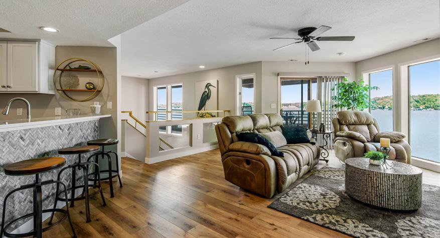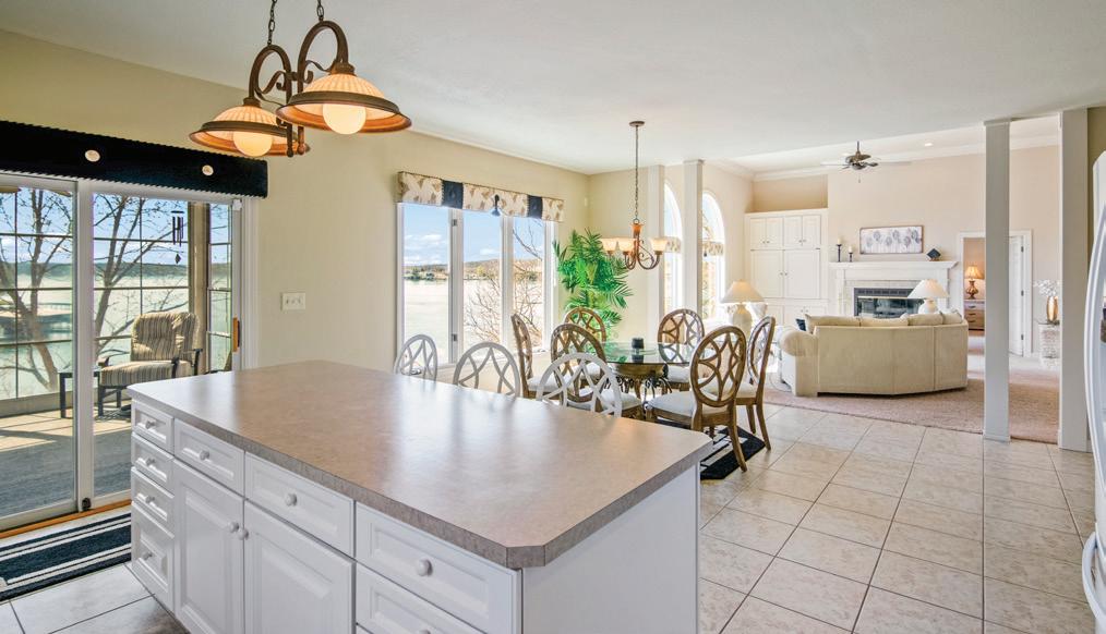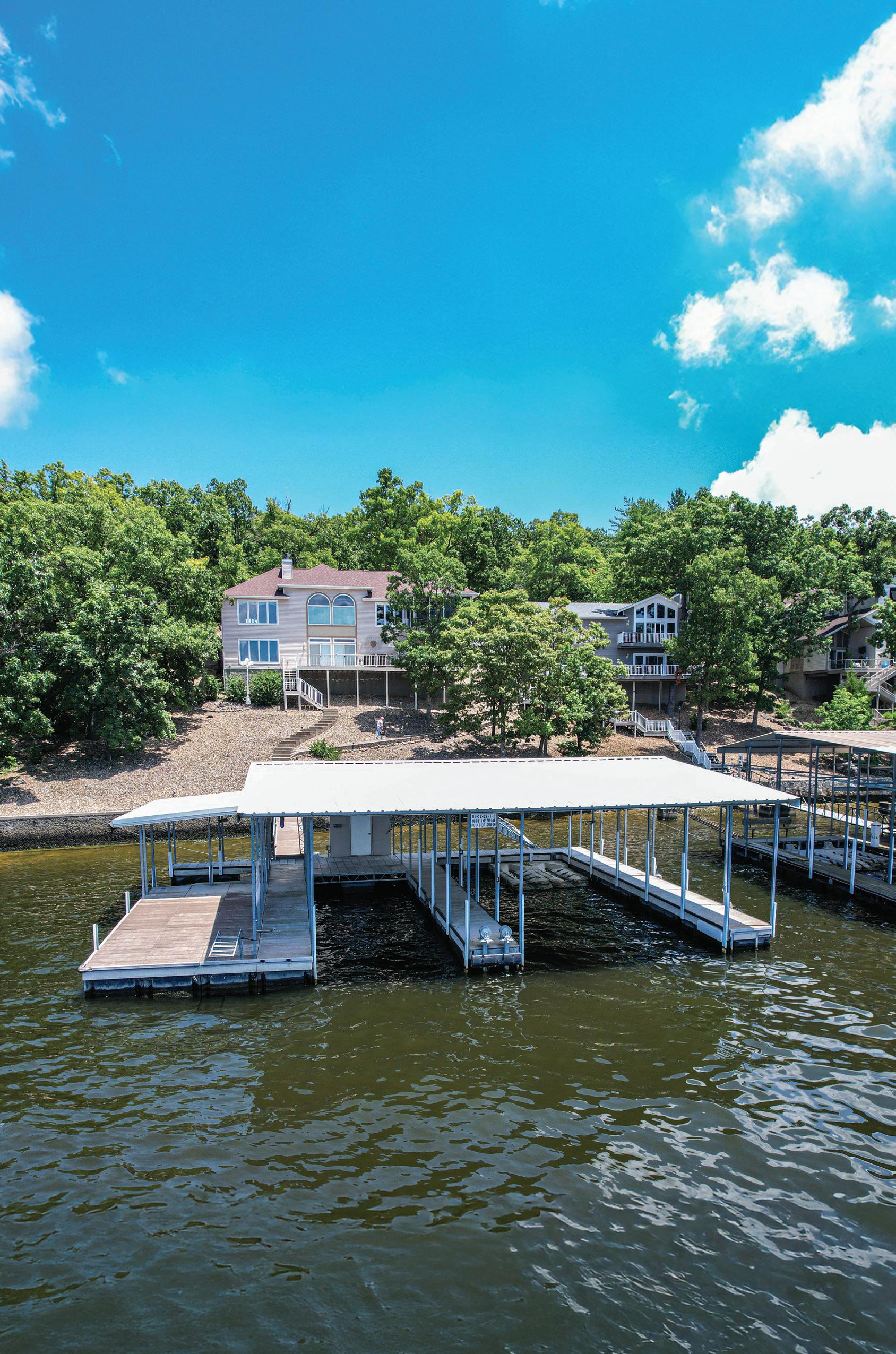 4 BR, 3.5 BA Located near town, community pool, tennis court, playground. Open floor plan, vaulted ceilings, wood floors, fireplace, granite counters, oversized master suite, 2-car garage, 2-slip dock. MLS 3579036 $840,000 4 BR, 3 BA, open floor plan, luxury vinyl flooring, vaulted ceiling, screened deck, lake view, hickory cabinets, custom back-splash, large master suite, 3-car garage, just minutes from Bagnell Dam MLS 3578986 $525,000