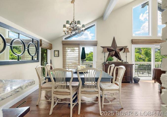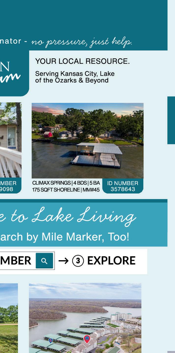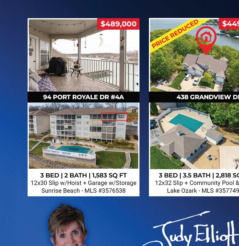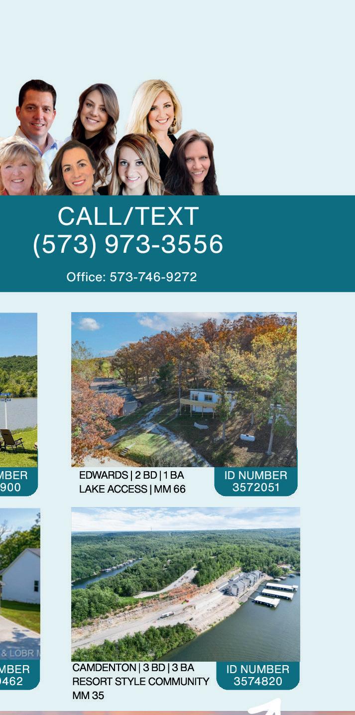 4 BR, 3.5 BA Located near town, community pool, tennis court, playground. Open floor plan, vaulted ceilings, wood floors, fireplace, granite counters, oversized master suite, 2-car garage, 2-slip dock. MLS 3579036 $840,000 4 BR, 3 BA, open floor plan, luxury vinyl flooring, vaulted ceiling, screened deck, lake view, hickory cabinets, custom back-splash, large master suite, 3-car garage, just minutes from Bagnell Dam MLS 3578986 $525,000