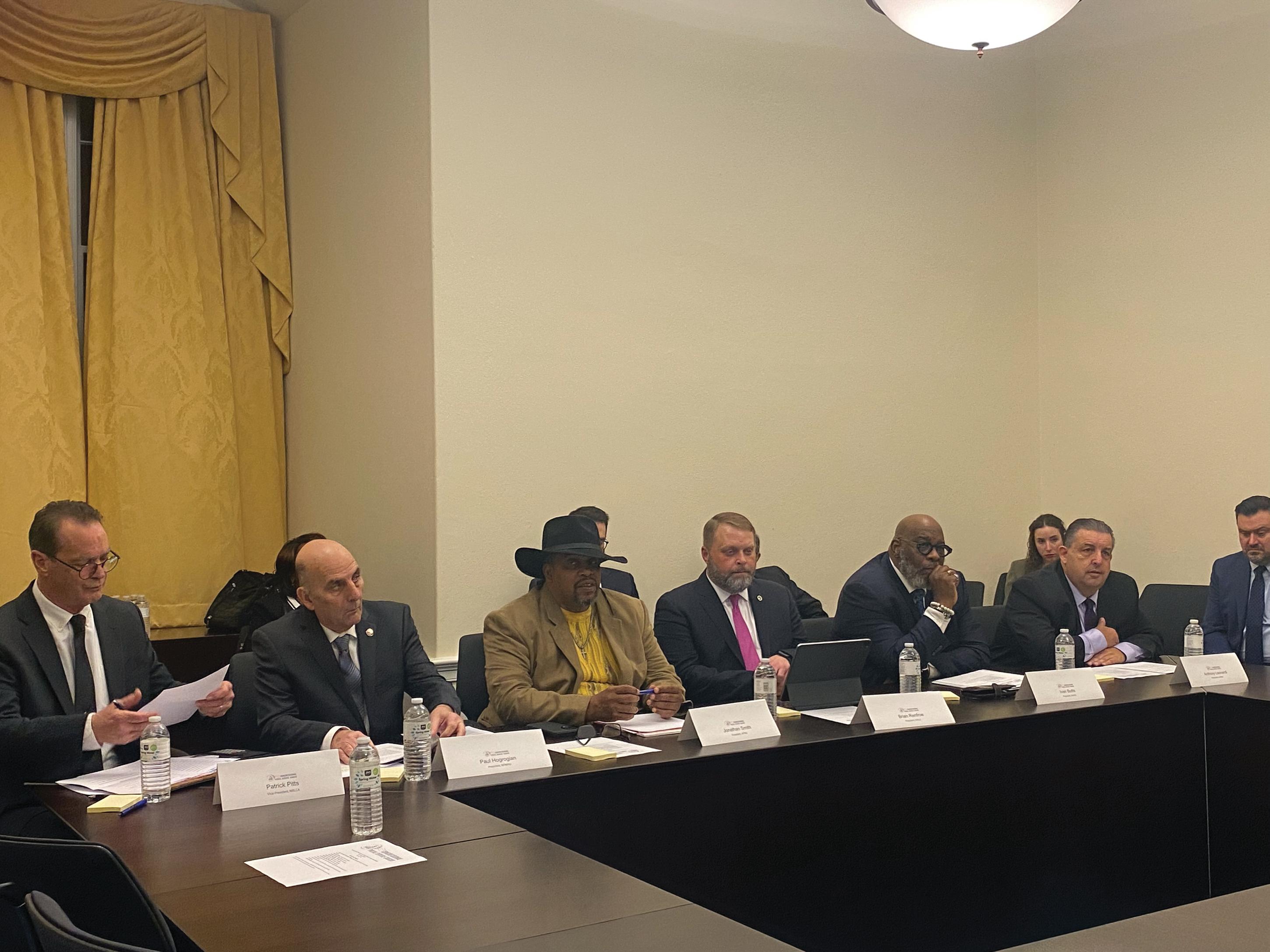 NPMHU President Paul Hogrogian is joined by the other union and management association presidents while speaking to the Congressional Postal Service Caucus.