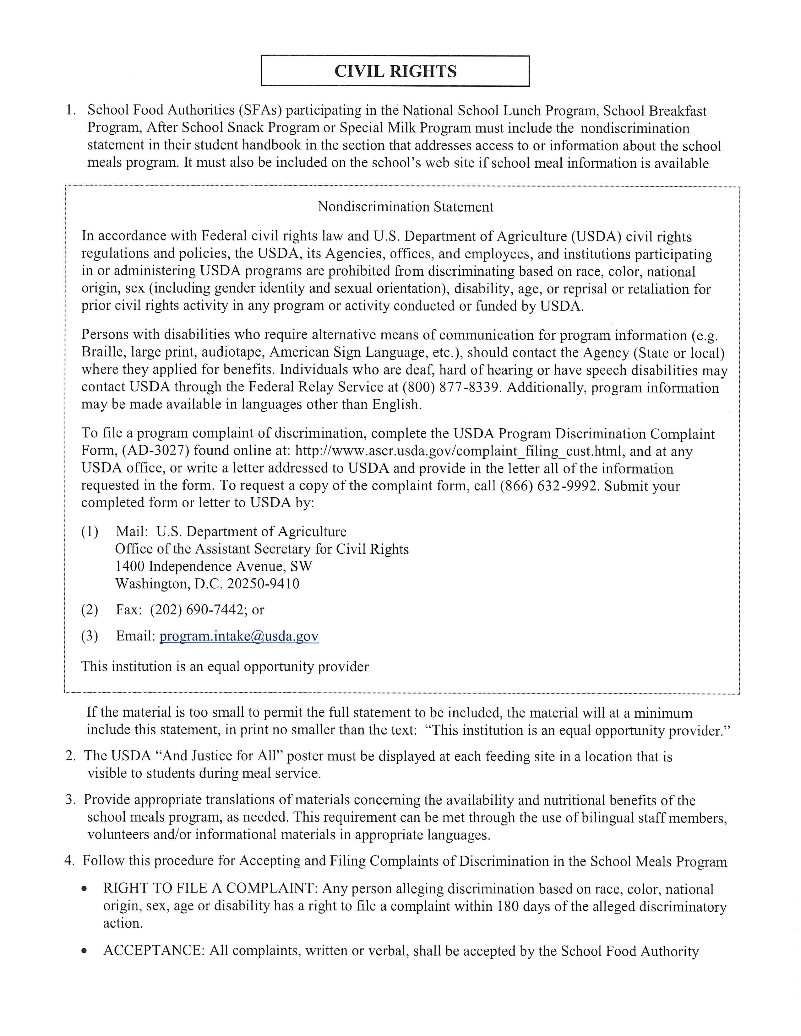 School Food Authorities (SFAs) participating in the National School Lunch Program, School Breakfast Program, After School Snack Program or Special Milk Program must include this statement in full, on all program materials used for public information, public education or public distribution.