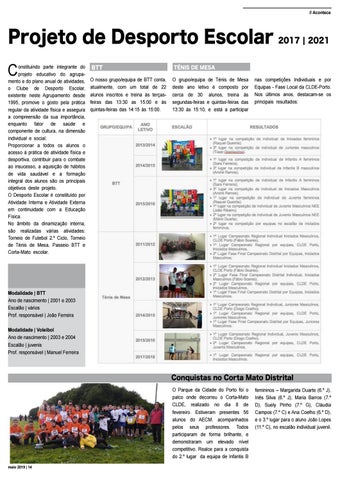 onstituindo parte integrante do projeto educativo do agrupa mento e do plano anual de atividades, o Clube de Desporto Escolar, existente neste Agrupamento desde 1995, promove o gosto pela prática regular da atividade física e assegura a compreensão da sua importância, enquanto fator de saúde e componente de cultura, na dimensão individual e social. Proporcionar a todos os alunos o acesso à prática de atividade física e desportiva, contribuir para o combate ao insucesso, a aquisição de hábitos de vida saudável e a formação integral dos alunos são os principais objetivos deste projeto. O Desporto Escolar é constituído por Atividade Interna e Atividade Externa em continuidade com a Educação Física. No âmbito da dinamização interna, são realizadas várias atividades: Torneio de Futebol 2.º Ciclo, Torneio de Ténis de Mesa, Passeio BTT e CortaMato escolar.