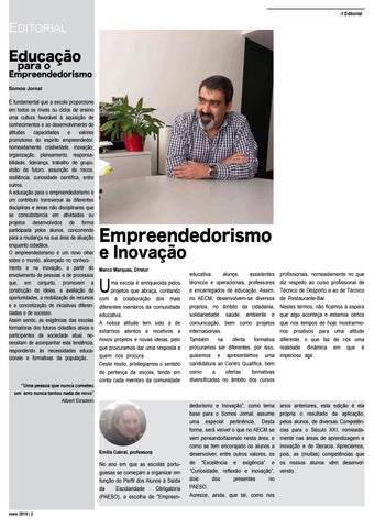 dedorismo e Inovação”, como tema base para o Somos Jornal, assume uma especial pertinência. Desta forma, será visível o que no AECM se vem pensando/fazendo nesta área, e como se tem encorajado os alunos a desenvolver, entre outros valores, os de "Excelência e exigência” e “Curiosidade, reflexão e inovação”, dois dos presentes no PAESO. Acresce, ainda, que tal, como nos