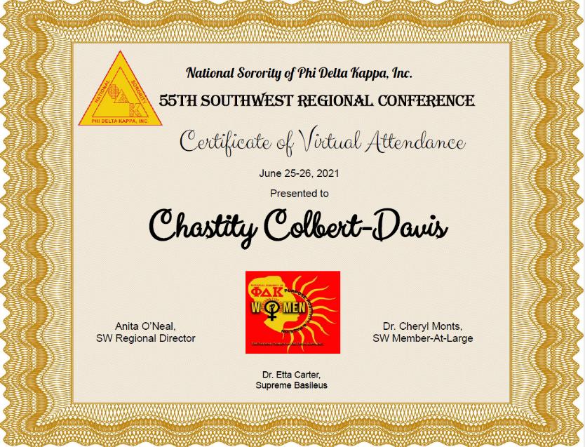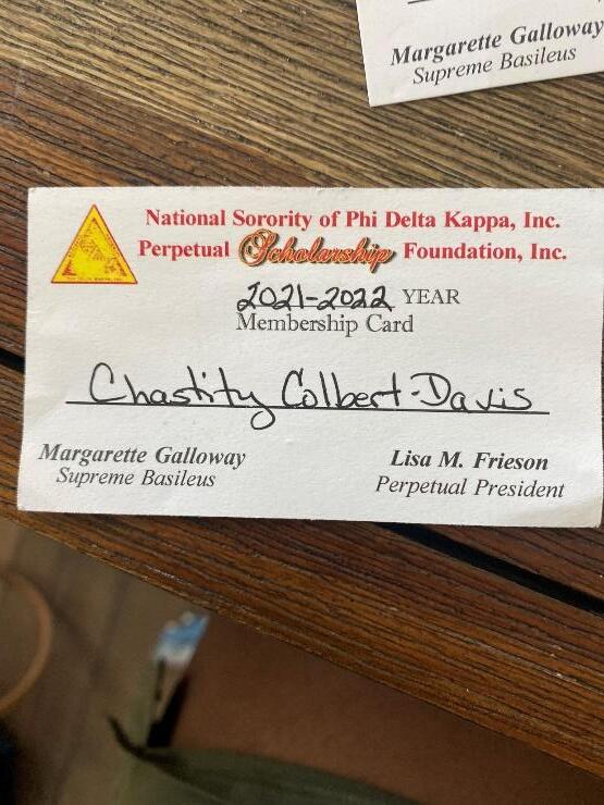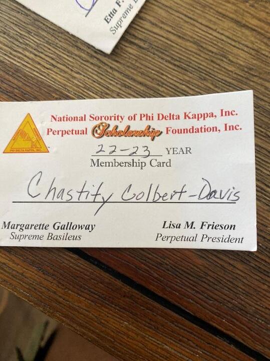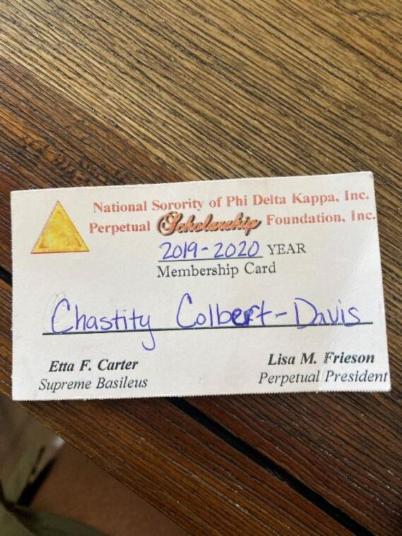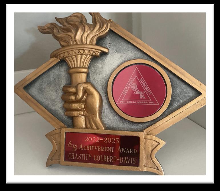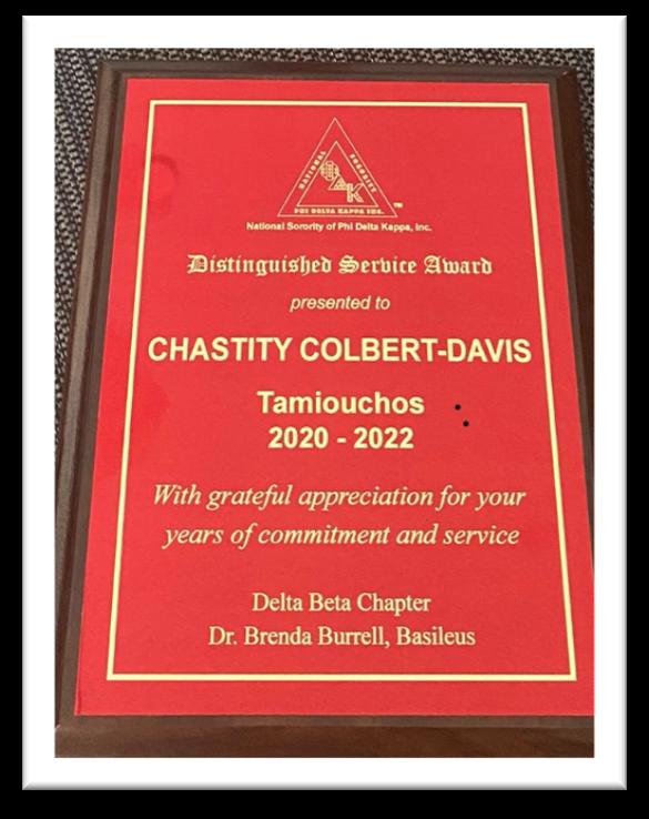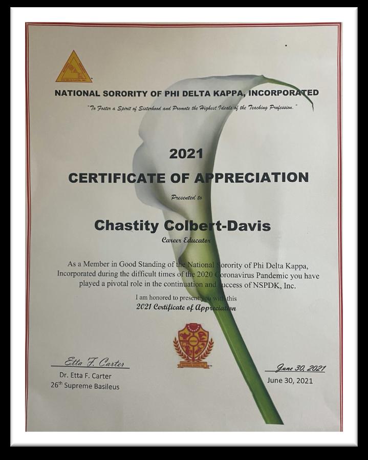 Soror Chastity Colbert-Davis became a member of the National Sorority of Phi Delta Kappa, Inc in 2018. Although only being in the sorority for 5 years, including a pandemic, she has demonstrated leadership capabilities and served unselfishly on committees. She has assisted her chapter, Delta Beta, in the following: