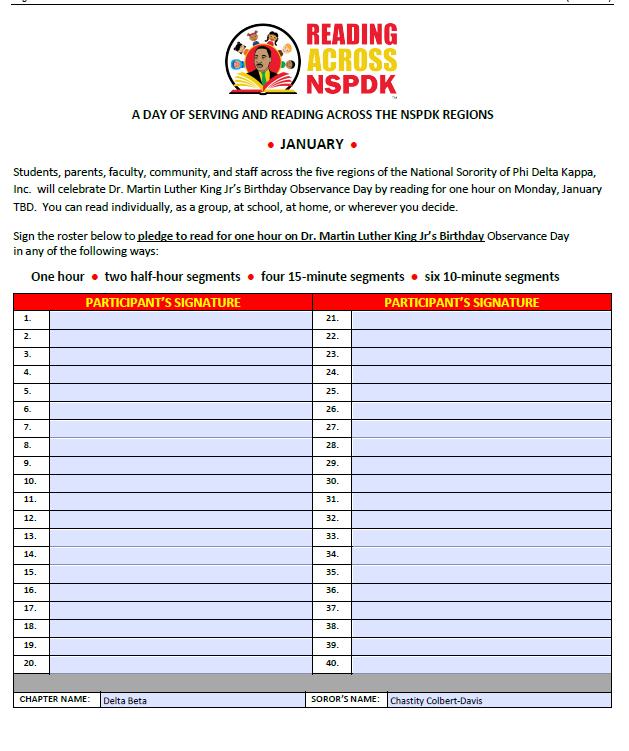 At the MLK Community March, my fellow Sorors and I collected signatures from people pledging to read as part of our "Reading Across NSPDK" program.