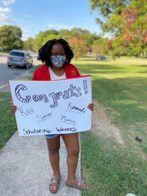 Soror Colbert-Davis holds a sign to congratulate graduates during the pandemic .