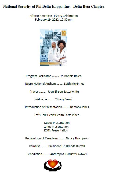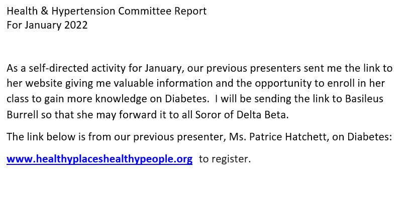 The Delta Beta Chapter has had guest speakers from places like Austin's "Healthy Places, Healthy People" give self-guided activities. During chapter meetings Soror Davis listens in presentations about health issues in Black communities like sickle cell and hypertension. Dancing is also encouraged at events to get the Sorors and Anthropos moving, and a low impact ropes course was conducted during as a way to incorporate teamwork and physical activity after the chapter meeting.