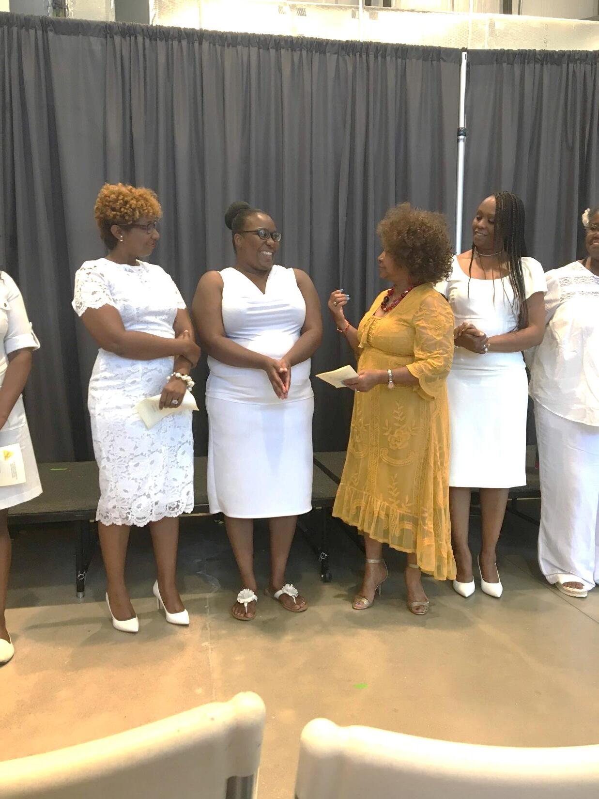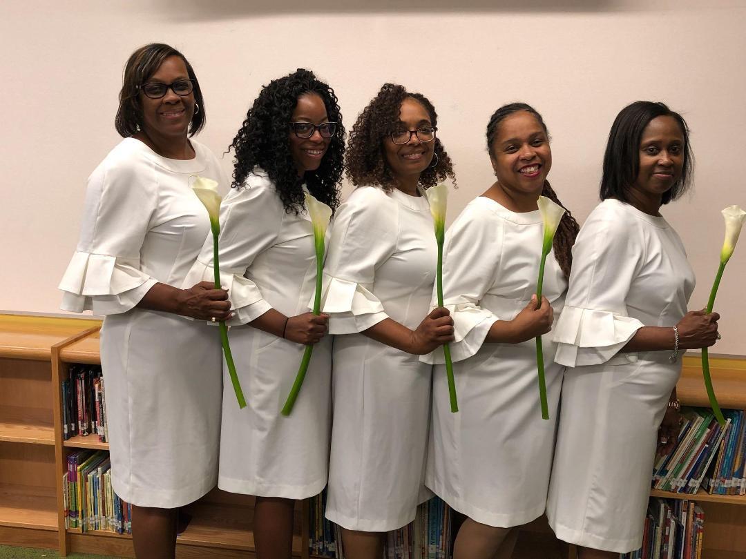 Soror ColbertDavis poses with her line sisters during her 2018 induction ceremony.