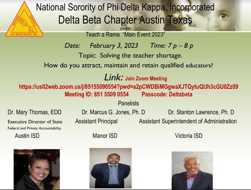 Due to the pandemic, Teach-A-Rama had not been held for a few years. This February, it returned with a panel on teacher retention. Our online program was attended by sorors from across the country and feared a quality discussion with Texas educators. I contributed a question about workload and inquired as to how we can solve the problems relating to burnout among teachers