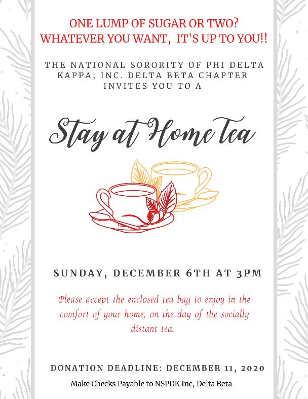 Soror Chastity Cobert-Davis has consistently participated in the Delta Beta Stay at Home Tea Fundraisers by collecting donations from friends and family. She has helped the committee by designing signage (wording) and planning Delta Beta’s 1st Tea Party.