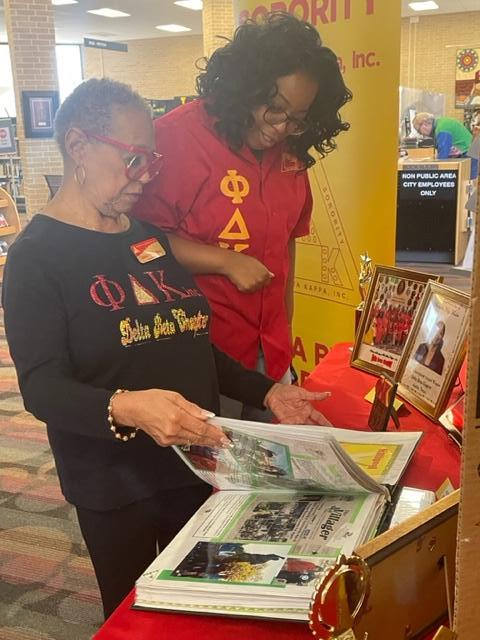 Soror Colbert-Davis helps set up a pop-up exhibit at the Washington Carver Museum in Austin The exhibit was a showcase for Delta Beta achievements for the 100th Anniversary of NSPDK,Inc.