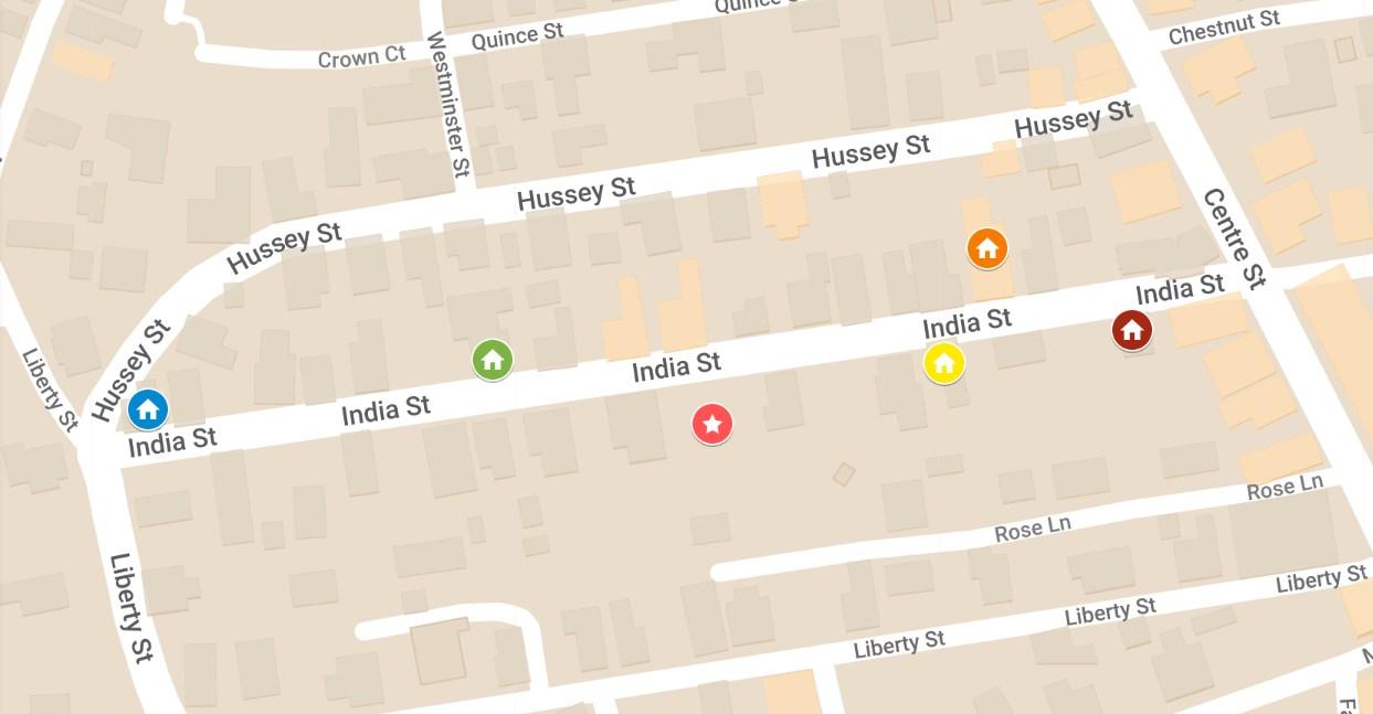 An 1816 deed calls the street “India” Street, and this name continues through the 1820s. “Pearl” reappears in the early 1830s and continued throughout the first half of the twentieth century. By the 1957 Street List of Registered Voters, the name of the residential end of the street was “India.” Today, the upper, middle, and lower parts of this busy residential and commercial street are called India Street.