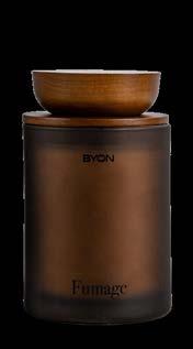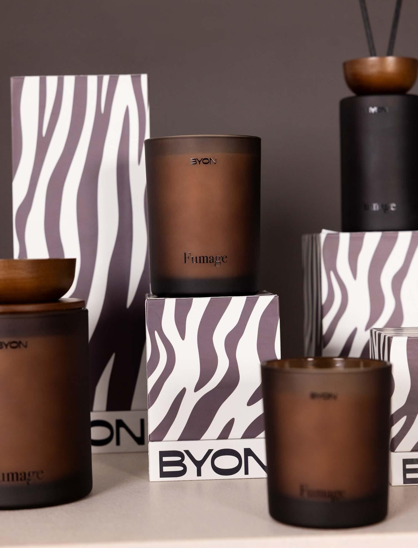 Fumage, Byon’s second room fragrance, transports you to new destinations where mystery, champagne, and tobacco scents merge in a captivating symphony. Crafted with the perfect blend of two fragrance notes, Fumage exudes a sophisticated, luxurious, and bold character while leaving an air of intrigue. Its distinct unisex notes inspire you to decorate with scent. The packaging is sober, featuring a tobacco-hued finish accented with dark wood, and the pattern playfully echoes the savannah’s trendsetting vibe in natural tones. Fumage includes five enchanting products – four scented candles and a room fragrance – that together guide you through Byon’s universe of scents. Delivered in Byon boxes. Design Byon Studio.