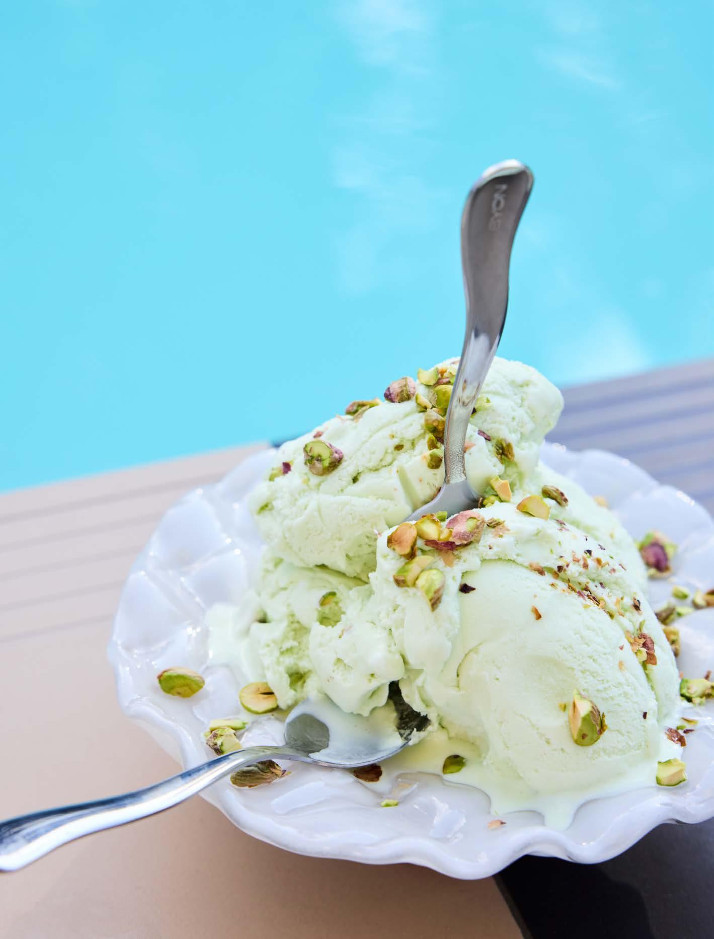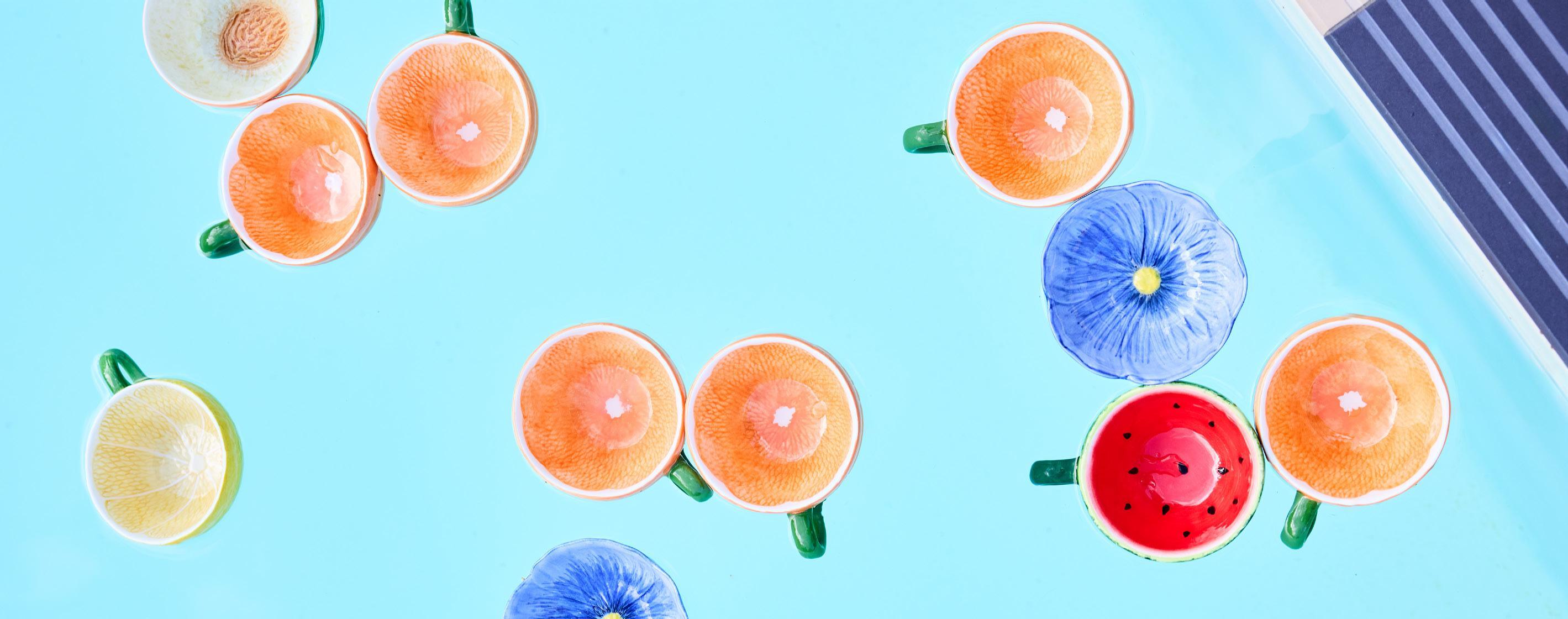 The colour palette is sun-bleached yet confident, with shades of peach, mint sorbet, buttery yellow and the sea in every shade. Sharply broken by red tones that step forward and claim their place – in true Byon style.