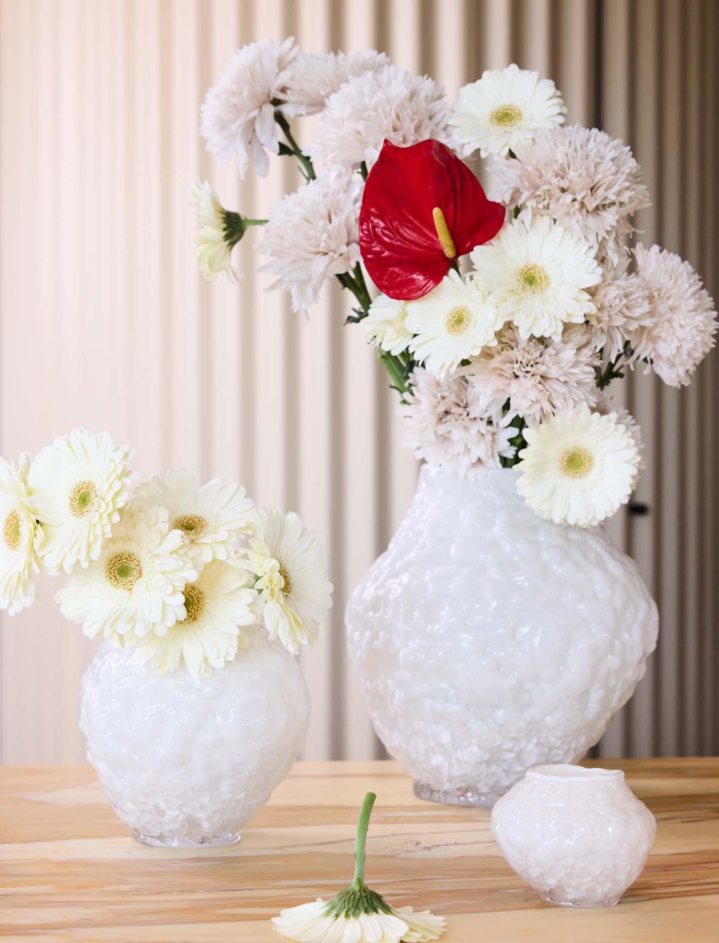 The texture of the glass resembles coral at the bottom of the sea. The shape is irregular and extravagant, confidently drawing all attention in a room or on a table. The new colours is crispy white and soft peach with an intriguing milky finish. Handcrafted in glass, each vase is unique. Available in several beautiful colours and models within the Corallo family. Variations in colour and structure may occur. Delivered in Byon box. Design Byon Studio.