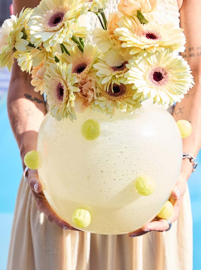 The Arlo vase is bold and extra in every way, just like Byon loves to be. With its round, substantial body adorned with glass balls, it makes a statement wherever it stands. A vase that is both iconic and playful at the same time. Arlo candle holder is a playful variation of our beloved Calore. Like its cousins, Arlo is multifunctional – use it as a vase, candle holder, or bowl. It fits everywhere and works beautifully in combination with both Lori and Lara candlesticks, where the colours complement each other. The beige colour mixed with citrus yellow creates an unbeatable combination. Handmade, variations in colour and texture may occur. Delivered in a Byon box. Design Byon Studio.