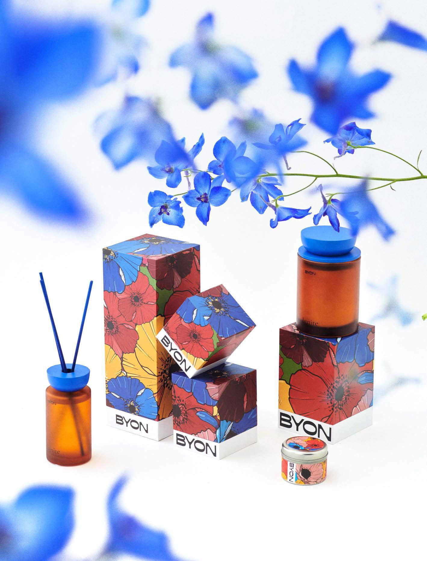 Let us introduce our first candle collection Ignite. A series of room fragrances designed to evoke a sense of comfort and happiness, topped with curiosity and strength. Ignite is a powerful explosion of creativity, a playful dance of colors, and a seductive composition of scents. Immerse yourself in imaginary floral notes mixed with a distinct weight of cedarwood. With five captivating products, including four scented candles and a room diffuser, we want to invite you on a journey into our unique world of fragrances. Byon’s universe. Delivered in Byon boxes. Design Byon Studio.