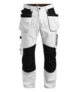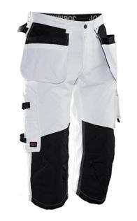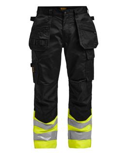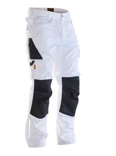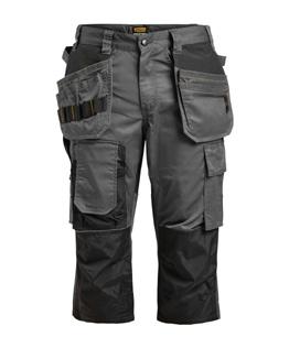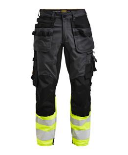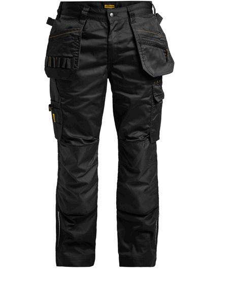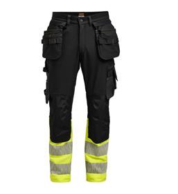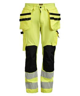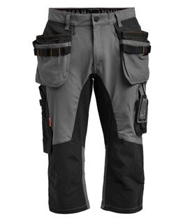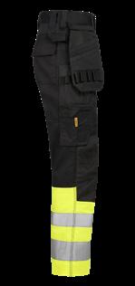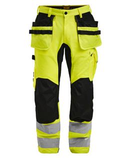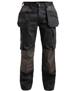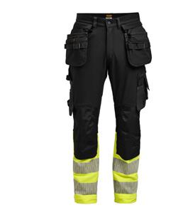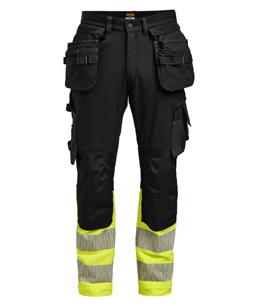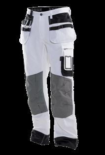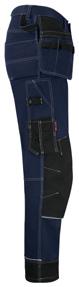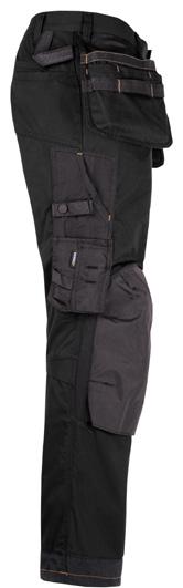 Comfortable work trousers in 4-way stretch with sections of durable woven fabric at ankle, leg pockets and holster pockets. Detachable zip-off holster pockets with extra compartments and reinforced inside. These can be tucked into the front pockets. Stretch comfort waistband. Welted back pockets. Extra belt loops in largest sizes. Hammer loop. Ruler pocket with knife pocket. Leg pocket with covered zip, ID card pouch and phone pocket. Pre-bent knees with kneepad pockets in durable polyamide and with dual-level inner opening, so kneepads can be fitted in two positions for optimal fit. Mesh at back of knee for ventilation. Trousers can be extended with 5 cm turn-up at ankle hem.Certified according to EN 14404:2004+A1:2010 Type 2 Level 1 together with Jobman’s kneepads 9943, 9944 and 9946.