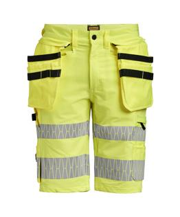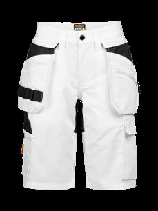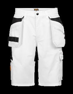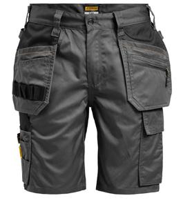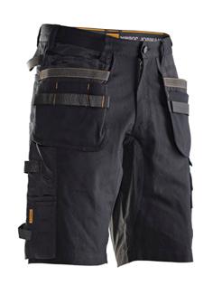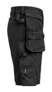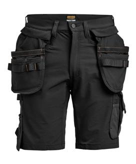 Black Shorts in 4-way stretch with sections of durable woven fabric at leg pockets and holster pockets. Detachable zip-off holster pockets with extra compartments and reinforced inside. These can be tucked into the front pockets. Stretch comfort waistband. Welted back pockets. Hammer loop. Ruler pocket with knife pocket. Leg pocket with covered zip, ID card pouch and phone pocket.
