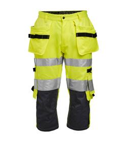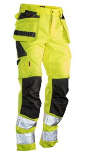 Comfortable 4-way stretch in durable Rip-stop fabric. Spacious holster pockets with extra compartments and reinforced insides, can be tucked into front pockets. Silicone rubber shirt-grip in waistband keeps the trousers in place. Crotch is reinforced with stretch Cordura®. Back pockets are partially detached to give easier access to contents. Extra belt loops in largest sizes. Hammer loop. Ruler pocket with knife button. Leg pocket with zip, phone pocket, ID-card pocket and extra pocket. Pre-bent knees for optimal fit. Knee pockets in durable stretch Cordura® with reflective piping and two positions for kneepads. Mesh at back of knee for ventilation. Reinforced at ankle-cuff with non-absorbing polyamide. Reflective piping and drawstring at ankle. Certified according to EN 14404:2004+A1:2010 Type 2 Level 1 together with Jobman’s kneepads 9943, 9944 and 9946.