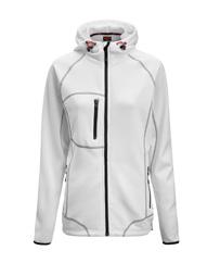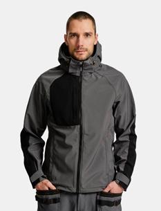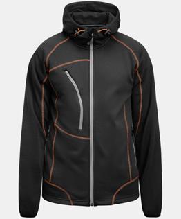 Softshell jacket with reinforcement / contrasts on sleeves and chest pocket. Removable hood, elastic drawstring around opening. Zipped frontpockets and chest pocket on right side. Inside in bird eye knit gives a good moister transport. Delrin zip at front with water repellent zip tape. Jacket is adjustable with elastic cord at bottom hem. Prebent sleeves, adjustable at bottom with velcro-straps. Water column: 3000 mm. Breathability: 3000 g/m² 24h. Shell fabric has a fluorine-free finish. BIONIC-FINISH® DWR-treatment. Certified according OEKO-TEX® Standard-100.