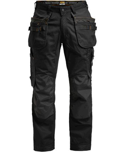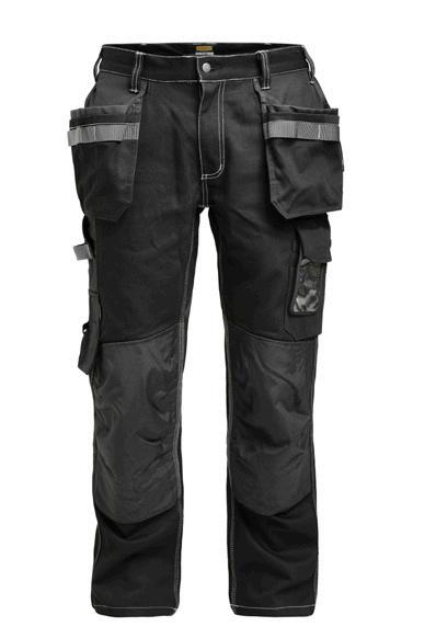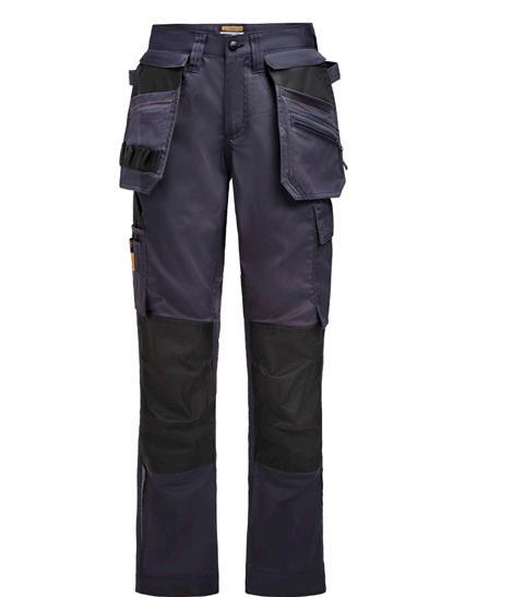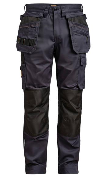 Comfortable 4-way stretch in durable Rip-stop material. Crotch gusset with reinforced stretch Cordura®. Spacious holster pockets with extra compartments and reinforced insides. These can be tucked into the front pockets. Silicone rubber shirt-grip in waistband. Extra belt loops in largest sizes. Welted back pockets. Hammer loop, ruler pocket with knife pocket. Leg pocket with covered zip, ID card pouch and phone pocket.