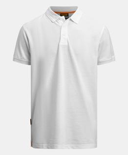 Polo shirt, single lacost knit with 3 pcs, tone-in tone buttons at front placket. Slit at sides. Collar and bottom sleeves in rib. Orange contrast tape at neckhole and slit at sides. Decorative fabric label on
