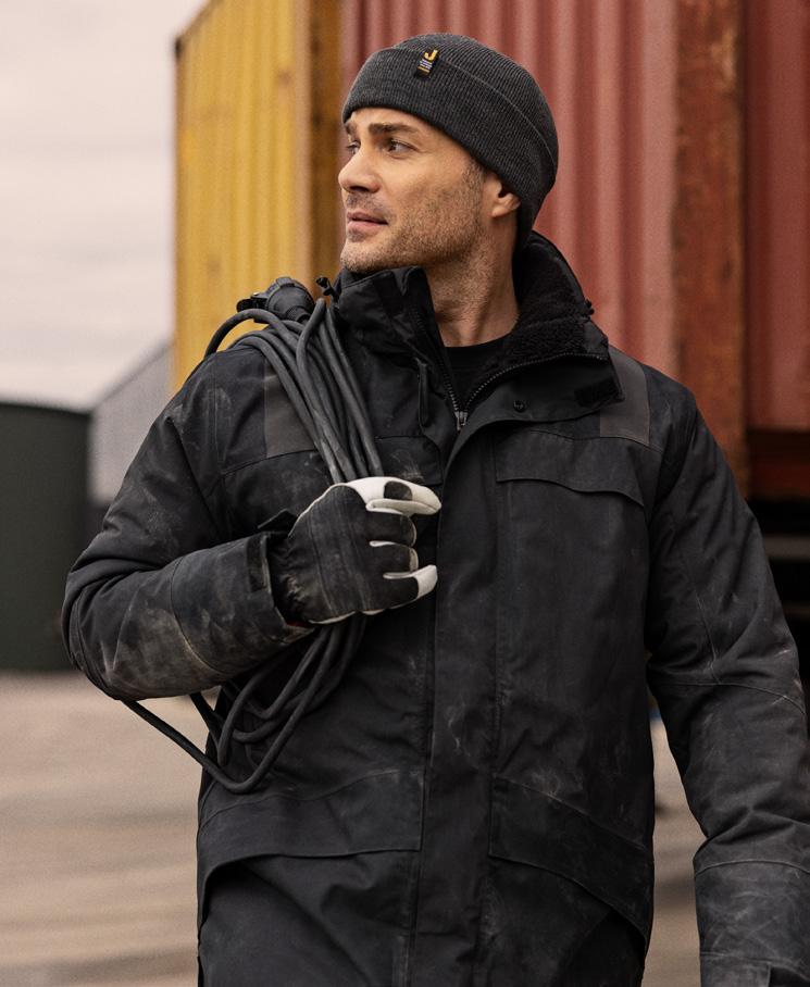 Weatherproof, durable clothing with protective features and reflective details for tough environments.