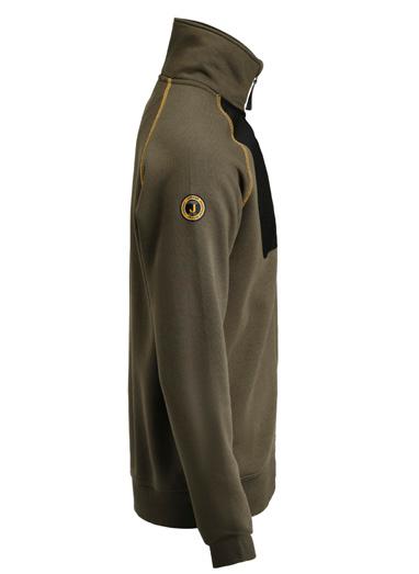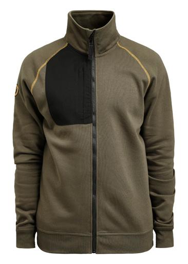 Sweatshirt, full-zip with raglan sleeves. Brushed inside gives good comfort. Zipped chest pocket on right side. Delrin zip at front with water repellent zip tape. Orange contrast tape at neckhole. Orange flatlock seams at raglan (only for color 7600 Olive green). Decorative fabric label on right sleeve (only on color 7600 Olive green).