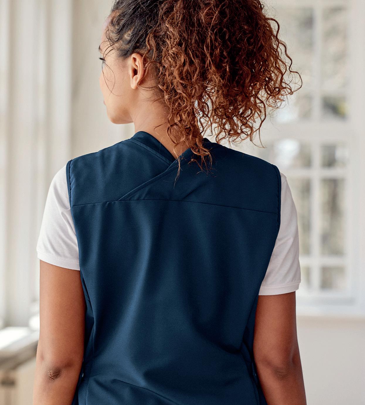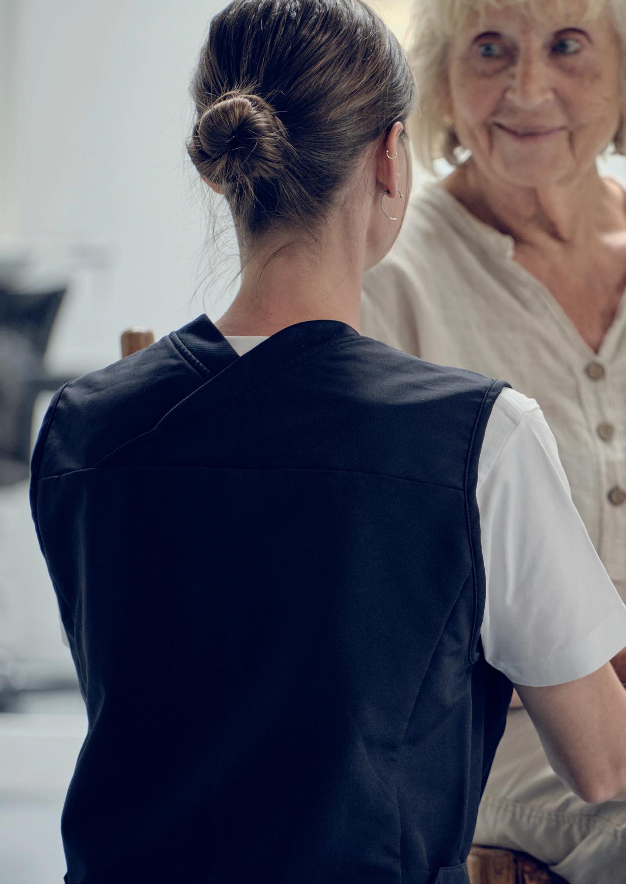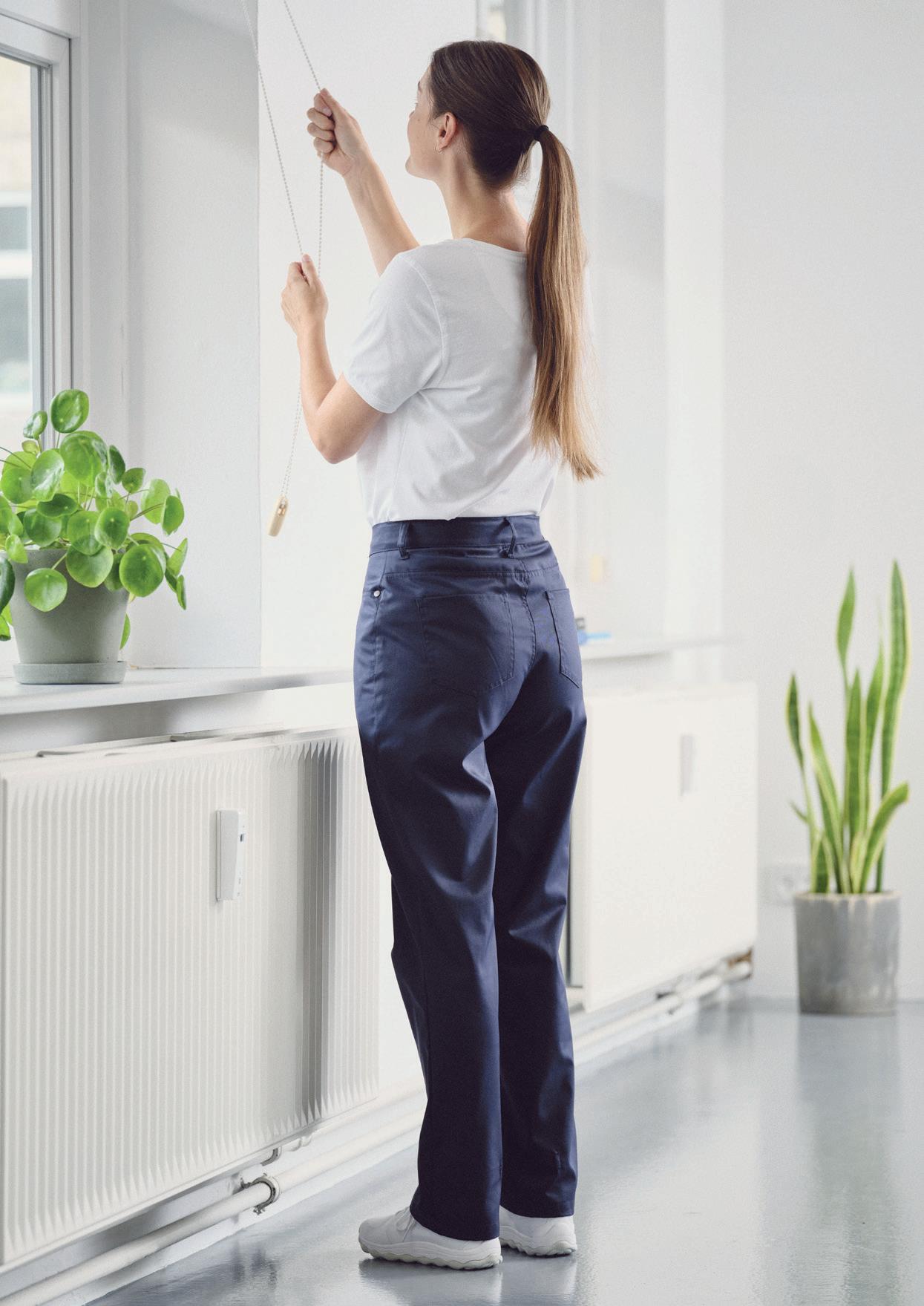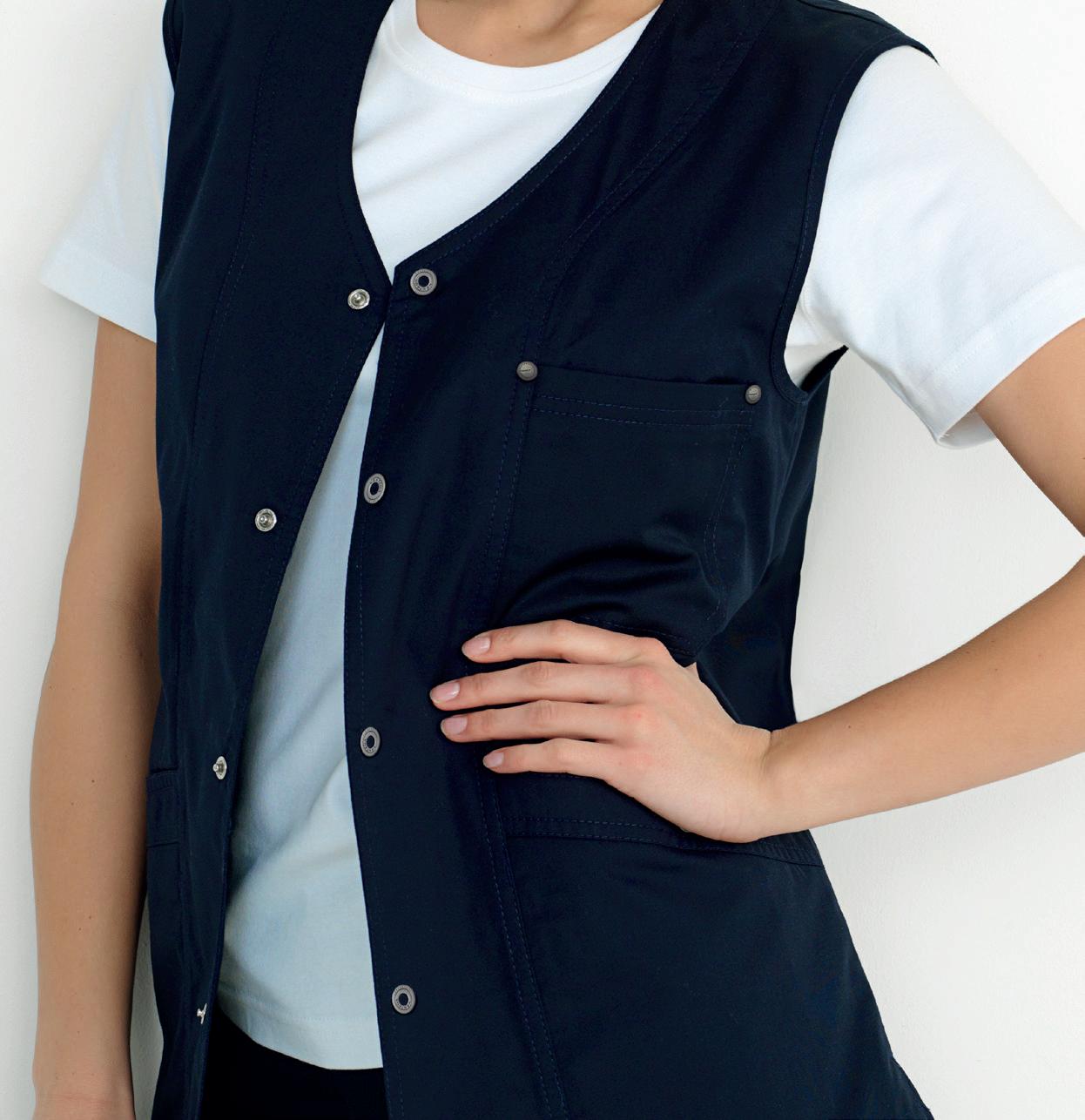 gør tøjet ekstra funktionelt. TENCEL™ Lyocell absorberer effektivt fugt, så brugeren forbliver tør, samtidig med at det hæmmer bakterievækst. Det lette materiale tørrer hurtigt efter vask, hvilket gør det særligt velegnet til et tempofyldt arbejde i sundhedssektoren.