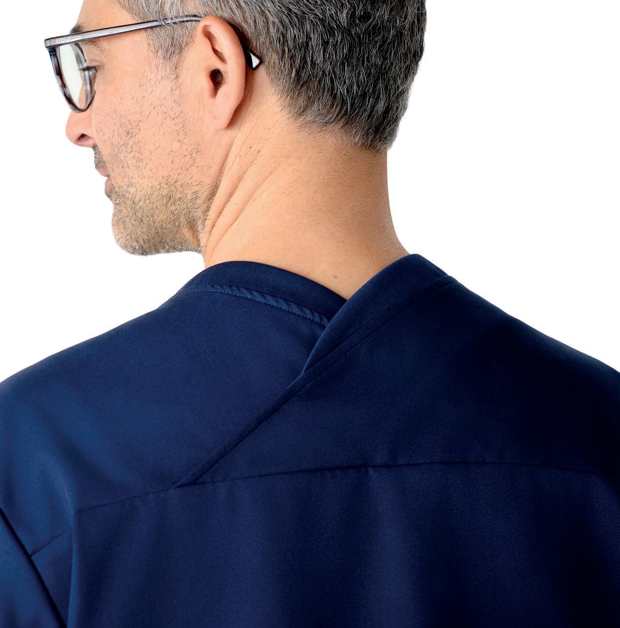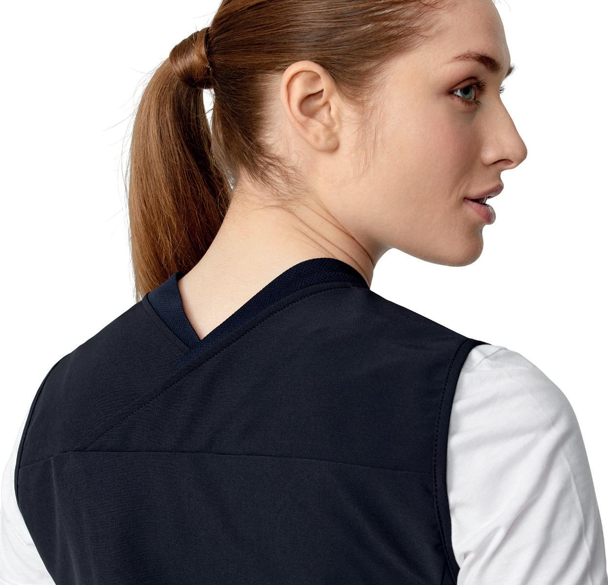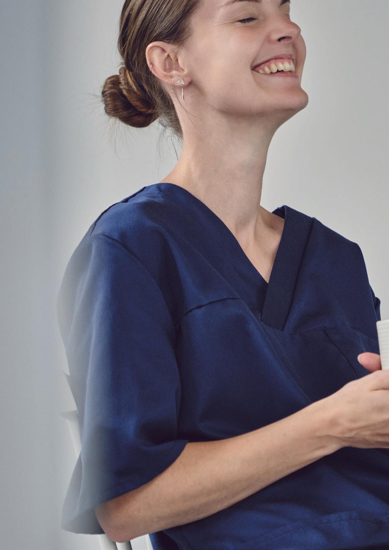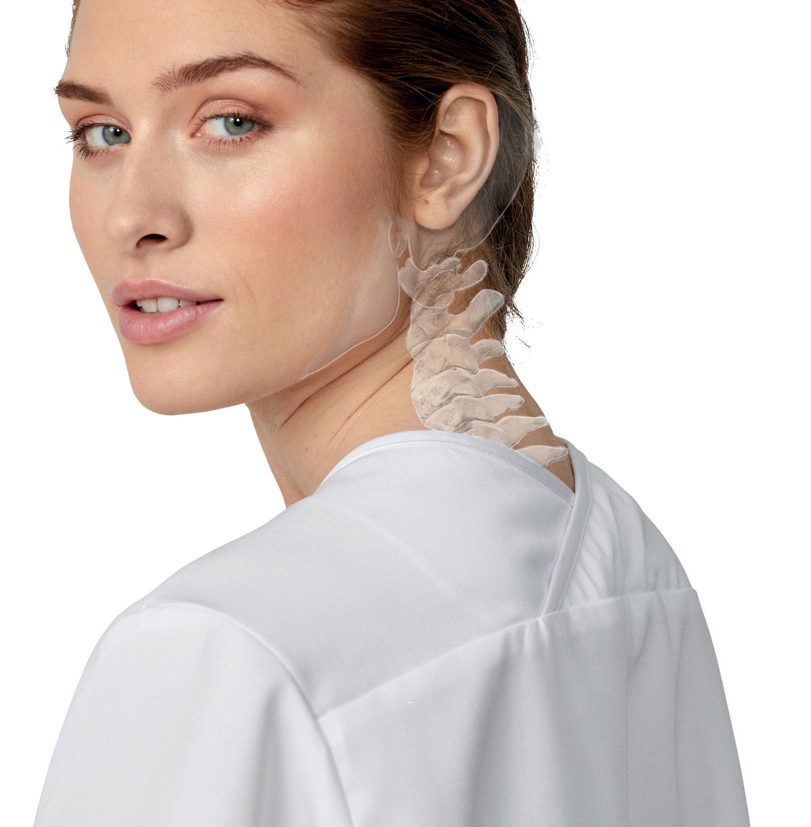 Det unikke i vores kollektion er overdelen, der har vores Ergonomic Neckline, som er et designbeskyttet snit i nakken. Den er blevet testet af Hohenstein Textile Testing Institute og har været en del af sundhedsfaglige fokusgrupper. Den helt særlige detalje frigør et eventuelt tryk på nakkehvirvel C7, hvilket mindsker risikoen for hovedpine, nakkesmerter og ubehag i skuldre, arme og fingre. En lille, men betydningsfuld funktion, der giver optimal komfort.