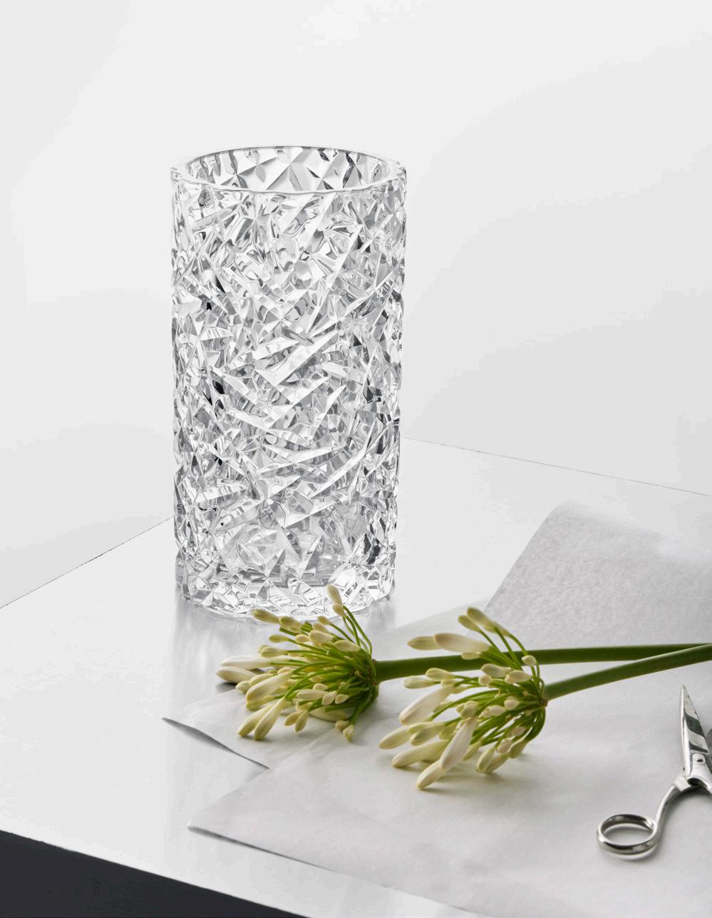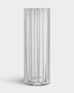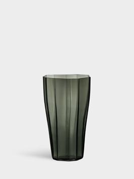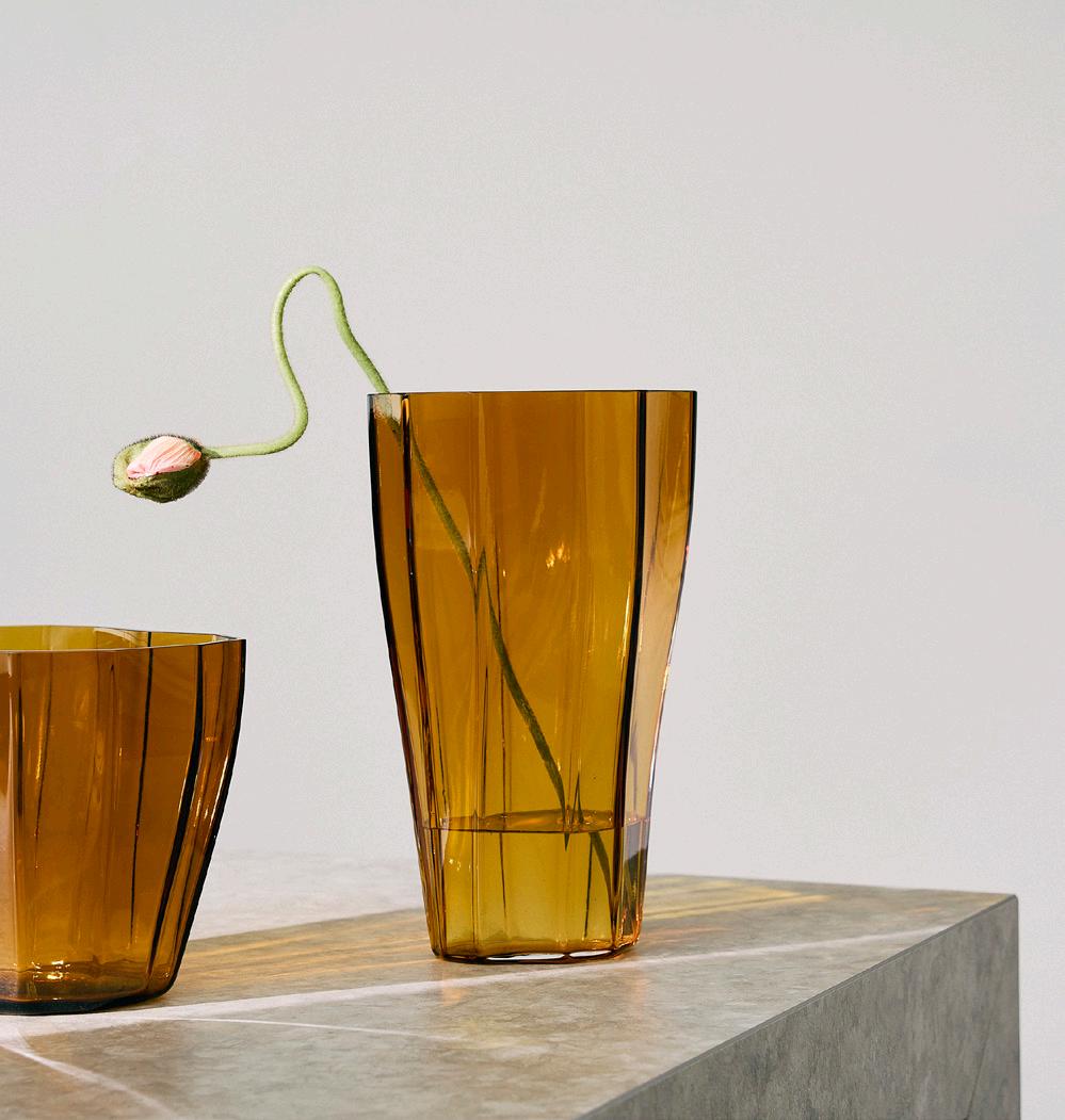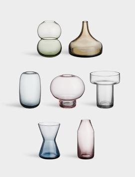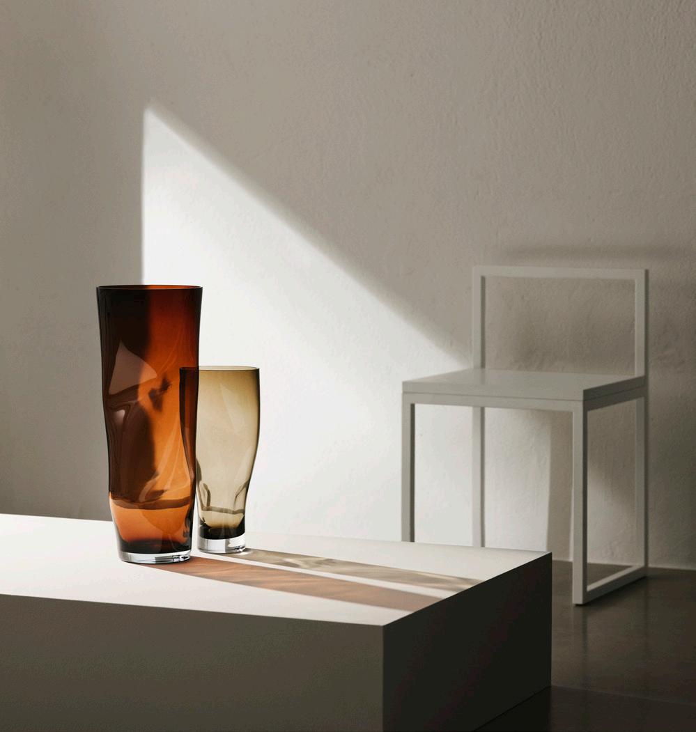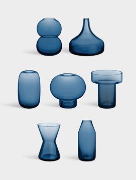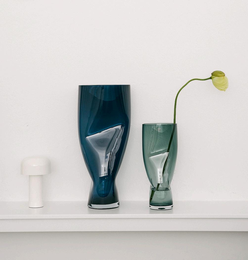 Like many other innovations, the idea for Squeeze arose by chance. While working on another shape entirely, Lena Bergström lost control of the sizzling, viscous glass, and the result was an asymmetrical inward bend. Inspired by her mistake, Bergström created Squeeze, intentionally reproducing its characteristic shape. The “squeezed” indentations interrupt the symmetry, while simultaneously serving a clear function: flowers placed inside are neatly held together rather than spread out, even those with only a few stems. The collection was first launched in 1997 and is available in multiple colors and sizes including the impressive new taller 500 mm version.