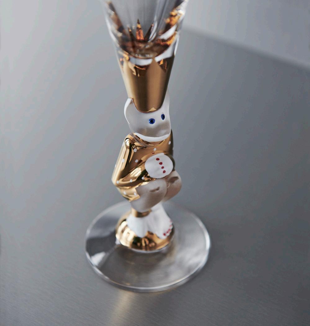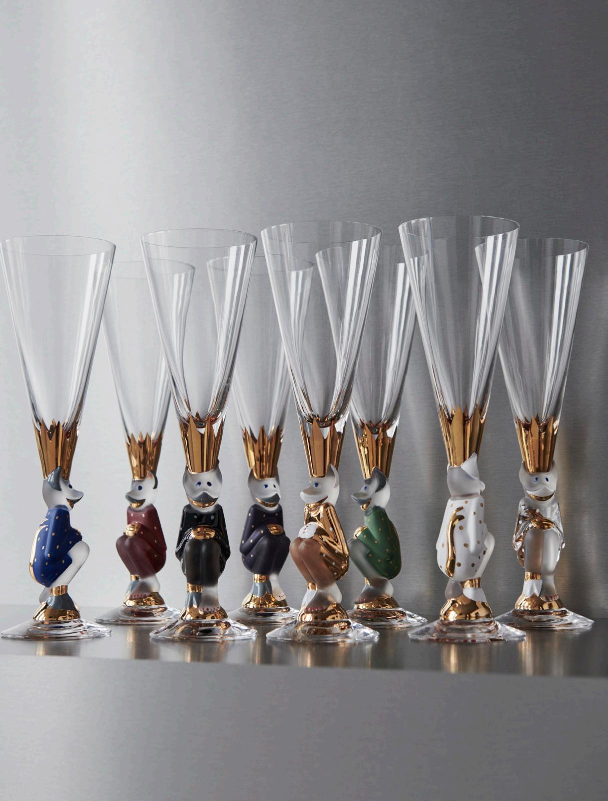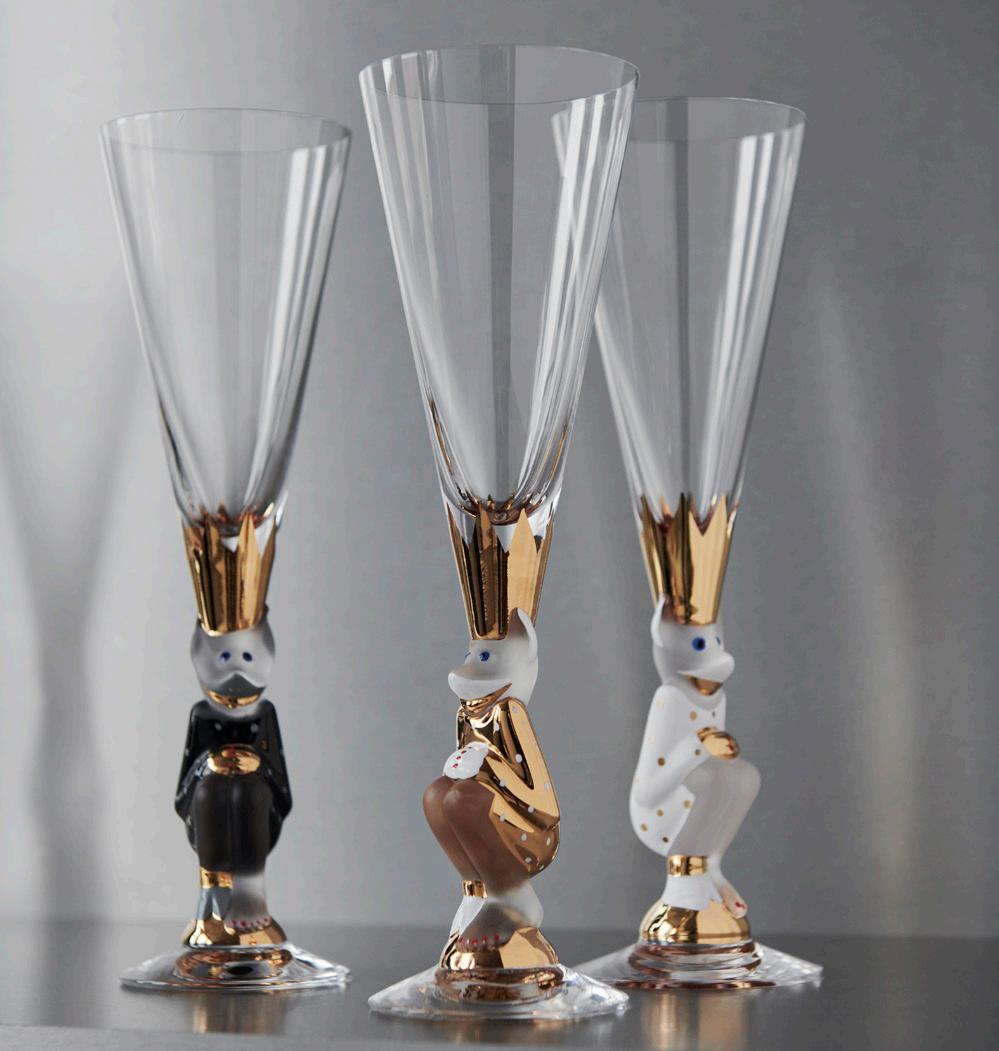 After Gunnar Cyrén passed away in 2013, the designer’s sons reviewed the sketches he had left behind. They found numerous sketches of a champagne glass inspired by the ”Snaps Devil” glass. The champagne glass, called Sparkling Devil, went into production and is now part of the Orrefors assortment. The product is mouth-blown in Sweden and each glass is hand-painted with details in real 21 carat gold. The collection is available in several colorways and a unique new edition is added annually until the collection is complete.
