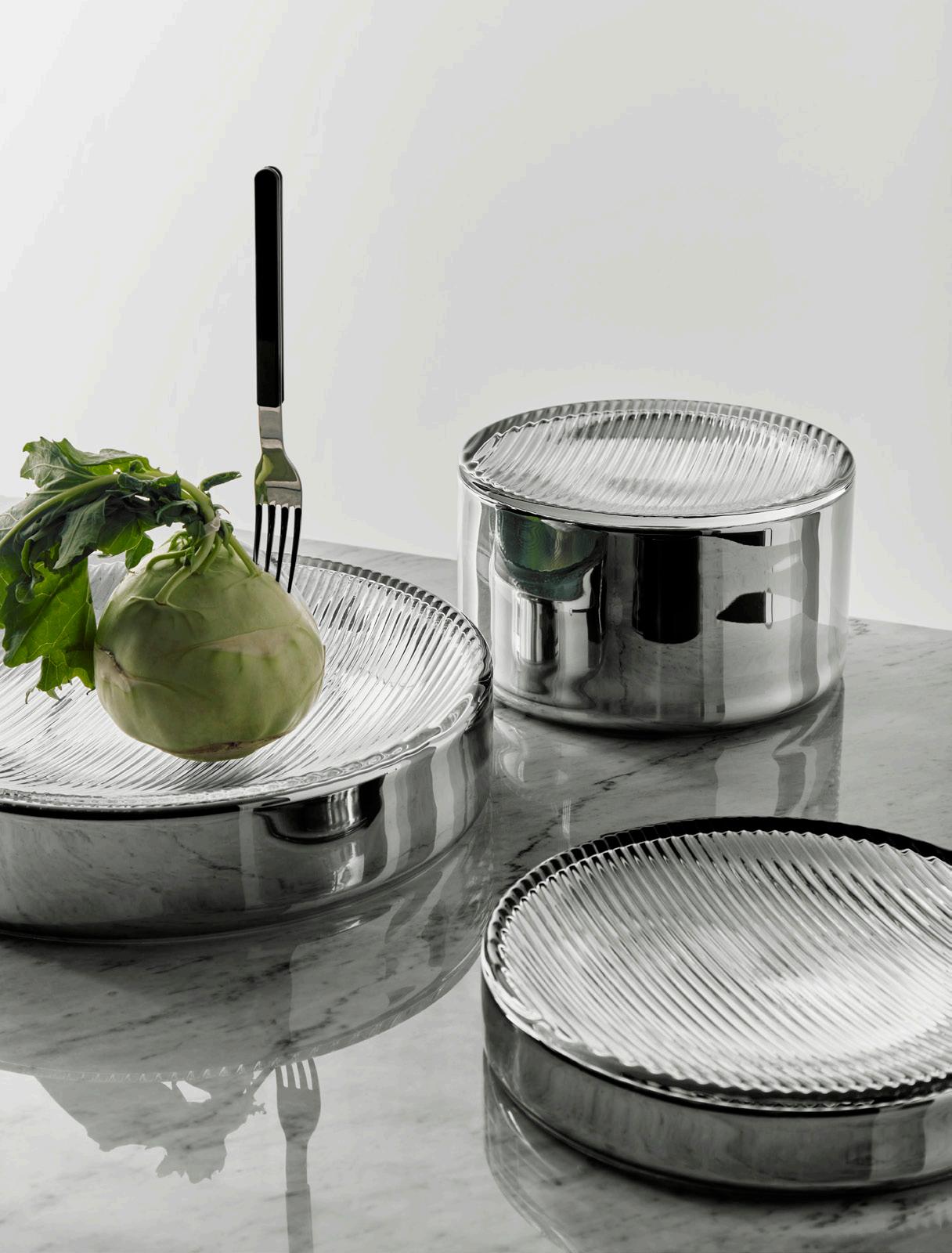 The extraordinary Array series by Mattias Stenberg for Orrefors consists of three plate-and-bowl combinations, all in silver, and with its own distinct expression. The varying heights and sizes of the pieces allow for versatile combinations also adding practical value, making it suitable for a variety of uses.