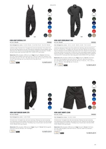 Materiale 65% polyester, 35% bomuld. Vægt 245 g/m². Farver 210 Khaki, 331 Rød, 530 Kongeblå, 540 Mørk Marine, 730 Grøn, 900 Hvid, 940 Sort, 941 Mørkegrå. Farven: 210, 331, 730, 900, 940, 941 fås i str. C44-C62, C146-C156. Farven: 530, 540 fås i str. C44-C62,C146-C156,D84-D132.