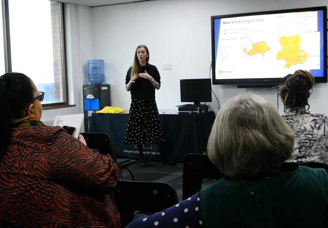 The second workshop focussed on the work of the New Vision English Hub and the London North East Maths Hub, both run at Elmhurst Primary School, and was led by Katie Tidmarsh, English Hub Lead, and Samira Islam, Maths Hub Lead New Vision English Hub is one of 34 English Hubs at primary schools across England. The Hub supports schools to improve the teaching of early language and reading. Each Hub school has been chosen for its track record in excellent teaching of reading.
