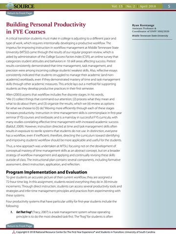 Building Personal Productivity in FYE Courses A critical transition students must make in college is adjusting to a different pace and type of work, which requires intentionally developing a productive workflow. The impetus for improving instruction in workflow management at Middle Tennessee State University (MTSU) came through the results of our regular program review, which is aided by administration of the College Success Factors Index (CSFI), an online survey that categorizes student attitudes and behaviors in 10 skill areas affecting success. Pretest results consistently demonstrated that time management, task management, and precision were among incoming college students’ weakest skills. Also, reflective essays consistently indicated that students struggled to manage their academic (and nonacademic) workloads, even if they demonstrated mastery of time and task management skills through other academic measures. This article lays out a method for supporting students as they develop productive practices in their first semester.