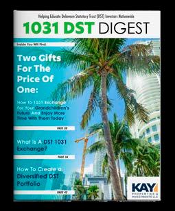 Real Estate Journal *Potential returns and appreciation are never guaranteed and loss of principal is possible. Please speak with your CPA and attorney for tax and legal advice.*The Debentures will bear non-compounded interest at the annual rate of 9.75% per annum (365-day year basis) on the outstanding principal, payable monthly on between the twentieth and twenty fifth day of the following month. An investment in the Debentures will begin accruing interest upon acceptance and closing of the Investor’s Subscription Agreement. There is a risk Investors may not receive distributions, along with a risk of loss of principal invested. This material does not constitute an offer to sell nor a solicitation of an offer to buy any security. Such offers can be made only by the confidential Private Placement Memorandum (the “Memorandum”). Please read the entire Memorandum paying special attention to the risk section prior investing. IRC Section 1031, IRC Section 1033 and IRC Section 721 are complex tax codes therefore you should consult your tax or legal professional for details regarding your situation. This material is not to be construed as tax or legal advice. There are material risks associated with investing in real estate securities including illiquidity, vacancies, general market conditions and competition, lack of operating history, interest rate risks, general risks of owning/operating commercial and multifamily properties, financing risks, potential adverse tax consequences, general economic risks, development risks and long hold periods. There is a risk of loss of the entire investment principal. Past performance is not a guarantee of future results. Potential cash flow, potential returns and potential appreciation are not guaranteed. Securities offered through FNEX Capital. Get More Out of Your 1031 Exchange on the kpi1031.com Marketplace DST Offerings from 25 Different Real Estate Sponsors 20-40 available Delaware Statutory Trust 1031 listings at any given time Investment options from $100K - $200M FREE DST 1031 Exchange Tool Kit Call Today to Also Learn About a Real Estate Fund With: Register at or call 855.875.2781 www.kpi1031.com • All-New 1031 DST Digest Magazine • 1031 Exchange Property Listings • Introductory DST Book for Investors 9.75% ANNUALIZED DISTRIBUTION POTENTIAL* 9.75% Annualized Distribution Potential Monthly ACH Distribution Payments Available for Cash Investments and IRAs