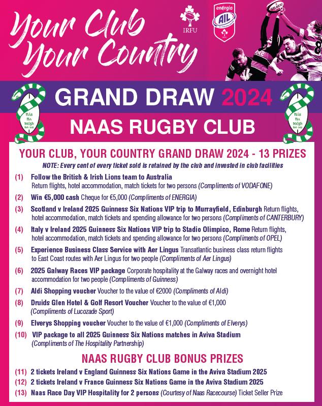 The 2024 Your Club Your Country Draw is now live. This annual initiative was first launched in 2011 providing valuable funds for participating clubs The total raised since then is €8.5m. Last year alone, clubs raised almost €1m in funding. ALL PROCEEDS from ticket sales remain in the club. Details of the draw, how to buy tickets and the brilliant prizes on offer, including exclusive Naas RFC bonus prizes, are included on the next page.