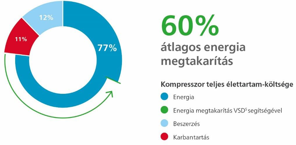 A VSDS kompresszor 60%-os energiamegtakarításra képes a fix fordulatszámú kompresszorokhoz hasonlítva. Ez a teljesítmény a VSD technológia 1994-es bevezetése óta töretlen lendülettel folytatott kutató-fejlesztő munka eredménye.