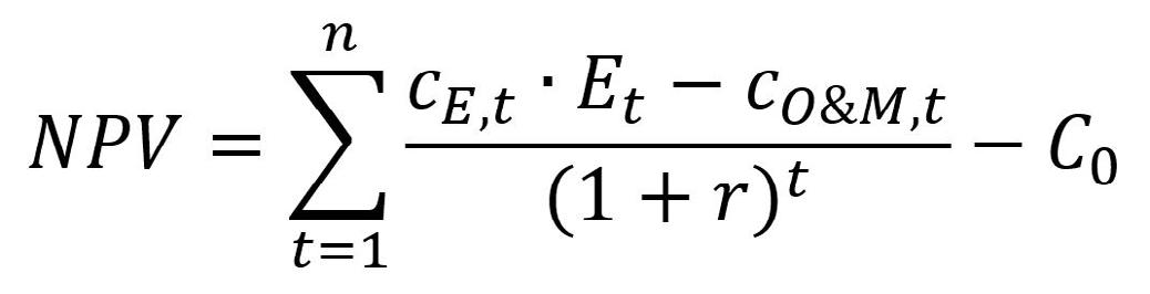 A nettó jelenérték számlálóját a villamosenergia megtakarításból származó bevételek és az üzemeltetési és karbantartási költségek különbsége adja meg. A kiindulási adatok és a kapott eredmény az alábbi táblázatban látható.