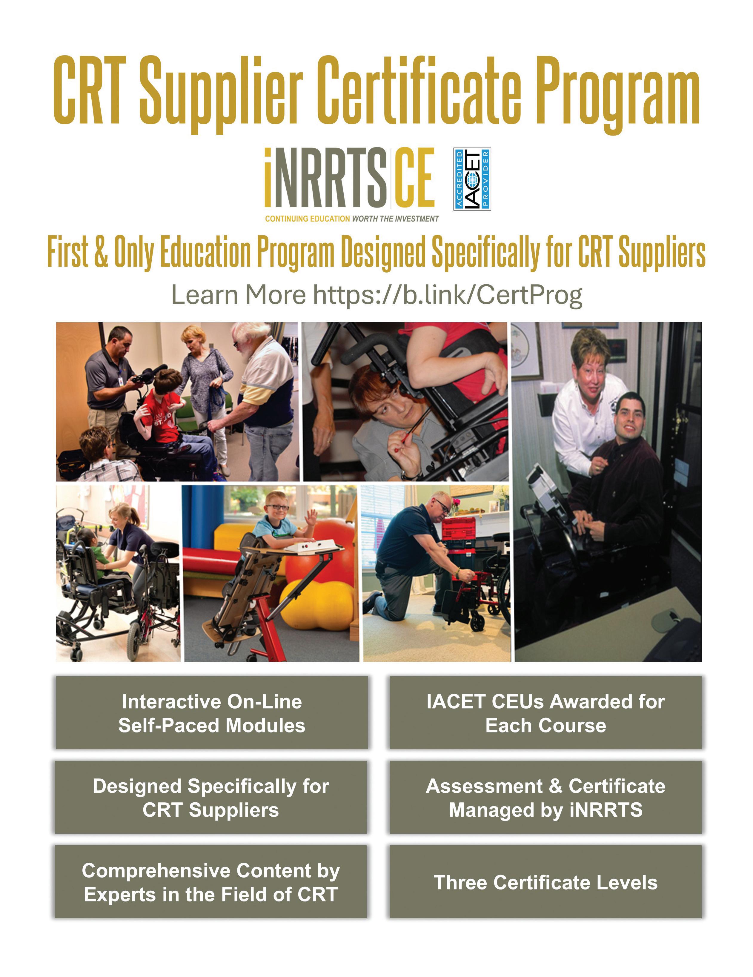 My one challenge for us all is once you have read this article, share the message of iNRRTS with your peers, clients, medical professionals and funding sources. Always ask, “Why do you not demand a Registered Rehabilitation Technology Supplier ® (RRTS ®) or a Certified Complex Rehabilitation Technology Supplier ® (CRTS ®) to provide to provide your equipment?” If you were counting on someone to improve and enhance your seating and mobility, would you not want someone who is committed to providing the best outcomes?